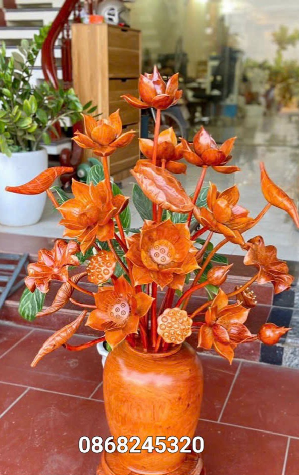 1 bình hoa sen 25 bông phong thủy trang trí phòng khách được làm bằng chất liệu gỗ hương đá tự nhiên 100% Kt bình cắm hoa 36×25cm+ hoa lá gương cao tổng 100 xèo rộng 70cm ,chưa tính kỷ  _ Bình hoa sen được tiện chạm khắc tỉ mỉ ,tinh xảo kỳ công .Đi hầu hết tất cả mọi chi tiết góc ngách nội dung hoa văn của bình hoa sen đều được kiểm định kỹ lưỡng khắt khe ,Như cho vào thẩm sấy cho gỗ khô kiệt .Mục đích chống dập nứt vênh mo mối mọt .Kết hợp với trà nhám đánh giấy giáp nhiều nước sờ mát lạnh .Song cho vào phun lót làm bóng mờ để giữ lại mầu sắc vân gỗ tự nhiên .Đẹp long lanh thu hút như ảnh trên .Bình hoa sen được làm và hoàn thiện do bàn tay khối óc tài hoa .Từ những người thợ giàu kinh nghiệm cũng như tay nghề cao trong làng nghề truyền thống .