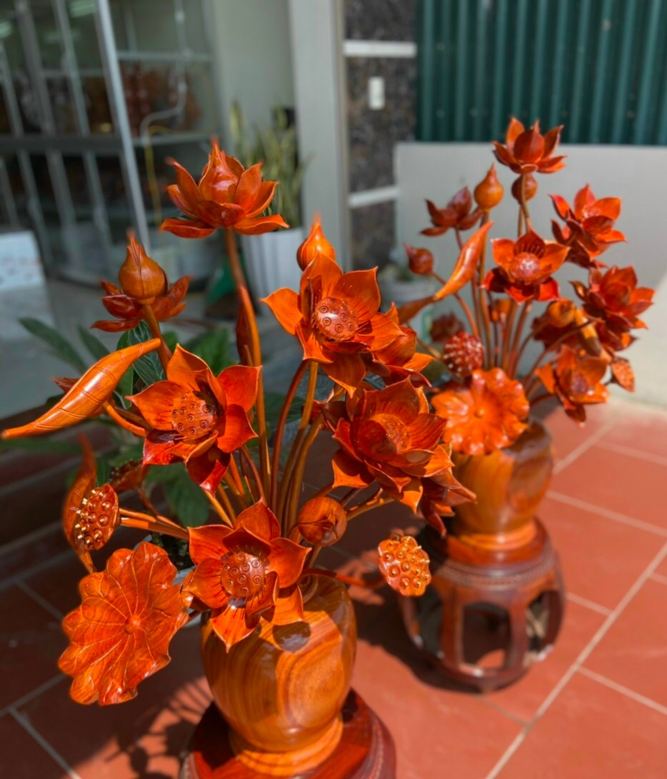 Bình hoa sen trang trí phòng khách ,phòng thờ được làm bằng chất liệu gỗ hương đỏ tự nhiên 100%  Kt bình cắm 30×25cm ,kt cao tổng kể cả  hoa lá gương 92cm ,xòe rộng 70cm  _ Bình hoa sen được tiện phân khúc từ đầu miệng ,xuống chân đế với độ mền mại với độ chính xác cao .Kết hợp với khắc tỉa hoa lá cành ,tỉ mỉ tinh sảo kỳ công .Đi hầu hết tất mọi tri tiết của bình hoa sen ,Được gọt tỉa chỉnh sửa ,kênh bong sắc nét hoàn toàn bằng tay thủ công .Đồng thời bình hoa sen được kiểm định kỹ lưỡng khắt khe ,như cho vào thẩm sấy cho gỗ khô kiệt .Mục đích trống dập nứt vênh mo mối mọt .Kết hợp với trà nhám ,đánh giấy giáp nhiều nước sờ mát lạnh song cho vào phun lót làm bóng mờ ,để giữ lại mầu sắc vân gỗ tự nhiên .Bình hoa sen được làm và hoàn thiện do bàn tay khối óc tài hoa .Từ những người thợ dầy rặn kinh nghiệm ,Cũng như tay nghề cao trong làng nghề truyền thống .Chính vì thế bình hoa sen bằng gỗ hương đỏ đã đáp ứng đầy đủ mọi tiêu trí cần thiết như ( Đẹp bền rẻ ) Thẩm mỹ nghệ thuật với chất lượng tuyệt vời