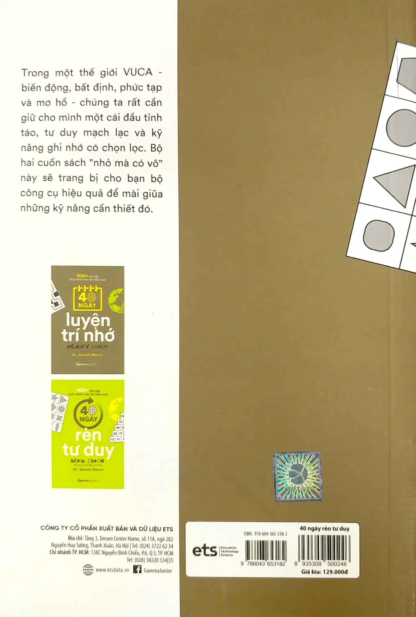 100+ Bài Tập Kích Thích Não Bộ Hiệu Quả: 40 Ngày Rèn Tư Duy Bộ não đóng vai trò then chốt trong mọi khía cạnh cuộc sống của chúng ta, vậy nên nó rất cần được chăm chút. Cuốn sách 40 ngày rèn tư duy là một chương trình huấn luyện theo ngày, khám phá não bộ theo từng bước nhỏ và đơn giản, giúp người đọc hiểu sâu cơ chế hoạt động của bộ não nhằm tận dụng tốt hơn các khả năng sẵn có, đồng thời cải thiện các kỹ năng của não bộ trong chưa đầy một tháng rưỡi.