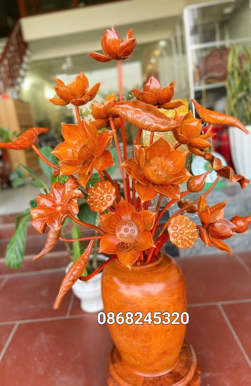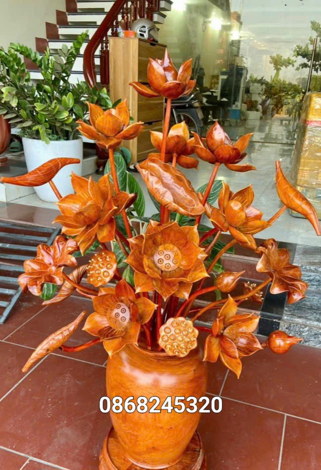 _ Bình hoa sen trang trí phòng khách ,phòng thờ được làm bằng chất liệu gỗ hương đỏ tự nhiên 100%  _ Kt bình cắm 30×25cm ,kt cao tổng kể cả  hoa lá gương 92cm