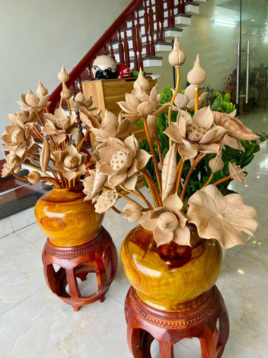 _ 2 bình hoa sen trang trí phòng thờ phòng khách ,được làm bằng chất liệu gỗ hương đỏ tự nhiên 100% _ Kt bình cắm 30×25cm + hoa lá gương cao tổng 92cm xòe