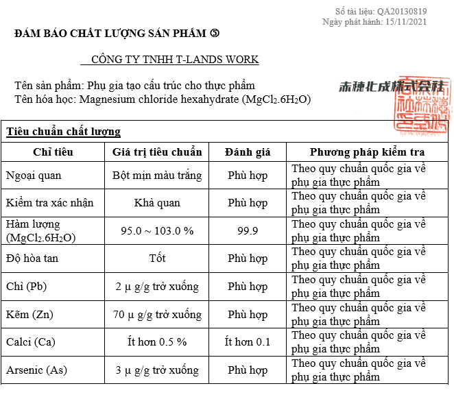 Thông tin về sản phẩm Tên thường gọi :Muối Nigari, muối Nhật, muối Nigari bột, muối làm đậu hũ Tên khoa học : MAGNESIUM CHLORIDE HEXAHYDRATE Thành phần : 100% Magnesi clorid (INS 511) Thành