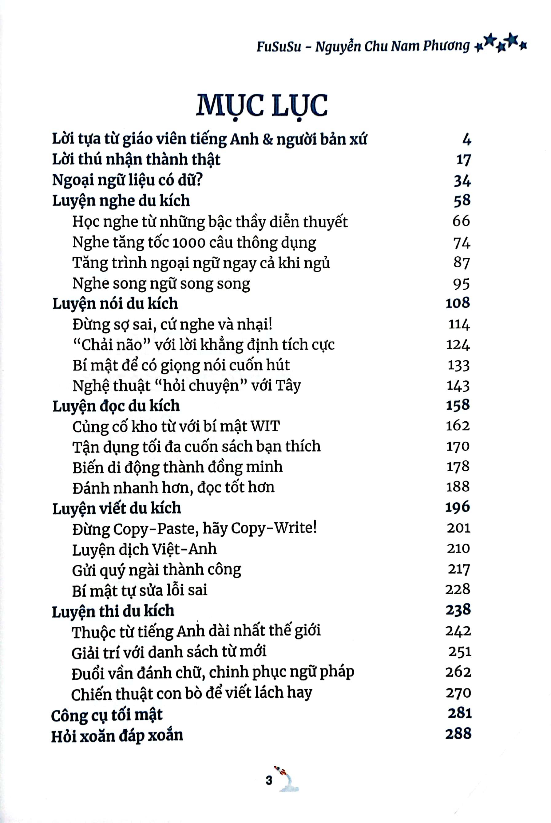 - Tự tin sử dụng tiếng Anh như một công cụ giúp bạn chinh phục mục tiêu, thăng tiến nhanh chóng. Hãy sở hữu ngay một cuốn 21 cách học tiếng Anh du kích, và bắt đầu hành trình biến tiếng Anh thành tiếng bố đẻ ngay từ hôm nay. Fususu là bút danh của Nguyễn Chu Nam Phương. Từng phải học lại tiếng Anh vỡ lòng, nhưng đã dịch hơn 6 cuốn sách của m.ình sang tiếng Anh, trong đó có 1 cuốn tiểu thuyết 100.000 chữ! Sợ phát âm sai, nhưng lại có thể đạt chức vô địch thuyết trình hài hước Toastmasters khu vực 5 nước Đông Nam Á (bằng tiếng Anh). Ngại giao tiếp, nhưng lại sáng lập CLB thuyết trình tiếng Anh ACI Toastmasters Online, giúp mọi người tự tin giao tiếp và thuyết trình tiếng Anh. Được công nhận là World Class Speaking Coach (Nhà Huấn Luyện Diễn Giả Quốc Tế) bởi nhà vô địch thuyết trình thế giới Craig Valentine. Điều đã giúp Nguyễn Chu Nam Phương thay đổi là niềm tin: Mọi thứ đều có thể, vấn đề là phương pháp. Có thể nói anh đã tìm ra con đường làm chủ tiếng Anh dễ dàng, hiệu quả.