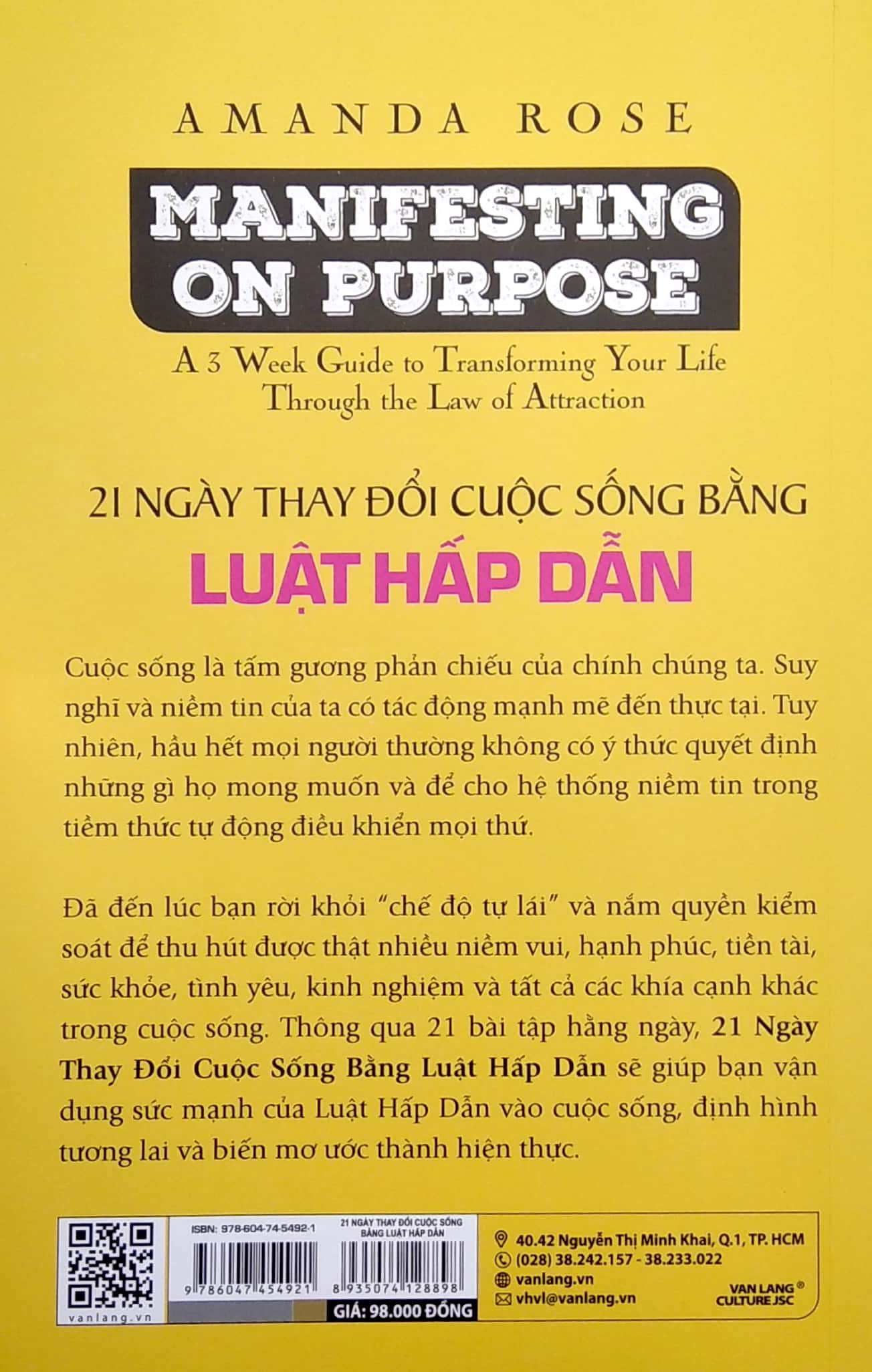 Mua tại Tiktok21 Ngày Thay Đổi Cuộc Sống Bằng Luật Hấp Dẫn Cuộc sống là tấm gương phản chiếu của chính chúng ta. Suy nghĩ và niềm tin của ta có tác động mạnh mẽ đến thực tại. Tuy nhiên, hầu hết mọi người thường không có ý thức quyết định những gì họ mong muốn và để cho hệ thống niềm tin trong tiềm thức tự động điều khiển mọi thứ. Đã đến lúc bạn rời khỏi chế độ tự lái” và nắm quyền kiểm soát để thu hút được thật nhiều niềm vui, hạnh phúc, tiền tài, sức khỏe, tình yêu, kinh nghiệm và tất cả các khía cạnh khác trong cuộc sống. Thông qua 21 bài tập hằng ngày, 21 Ngày Thay Đổi Cuộc Sống Bằng Luật Hấp Dẫn sẽ giúp bạn vận dụng sức mạnh của Luật Hấp Dẫn vào cuộc sống, định hình tương lai và biến mơ ước thành hiện thực.
