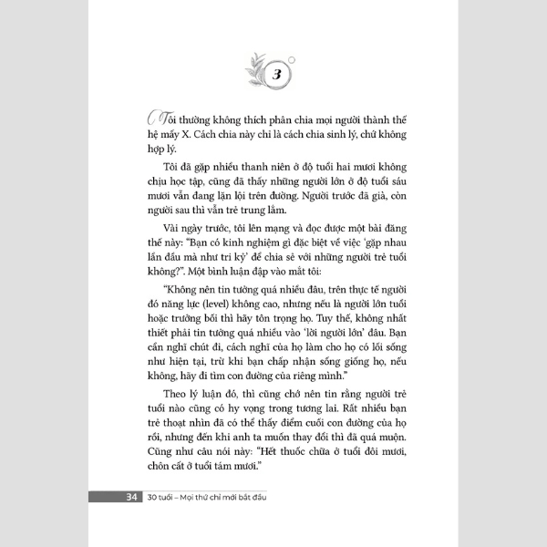 “Bởi vì, ba mươi tuổi mọi thứ chỉ mới bắt đầu. Đừng sợ đau khổ. Tất cả những khổ đau phải trải qua ở tuổi đôi mươi đều là món quà của cuộc sống.”