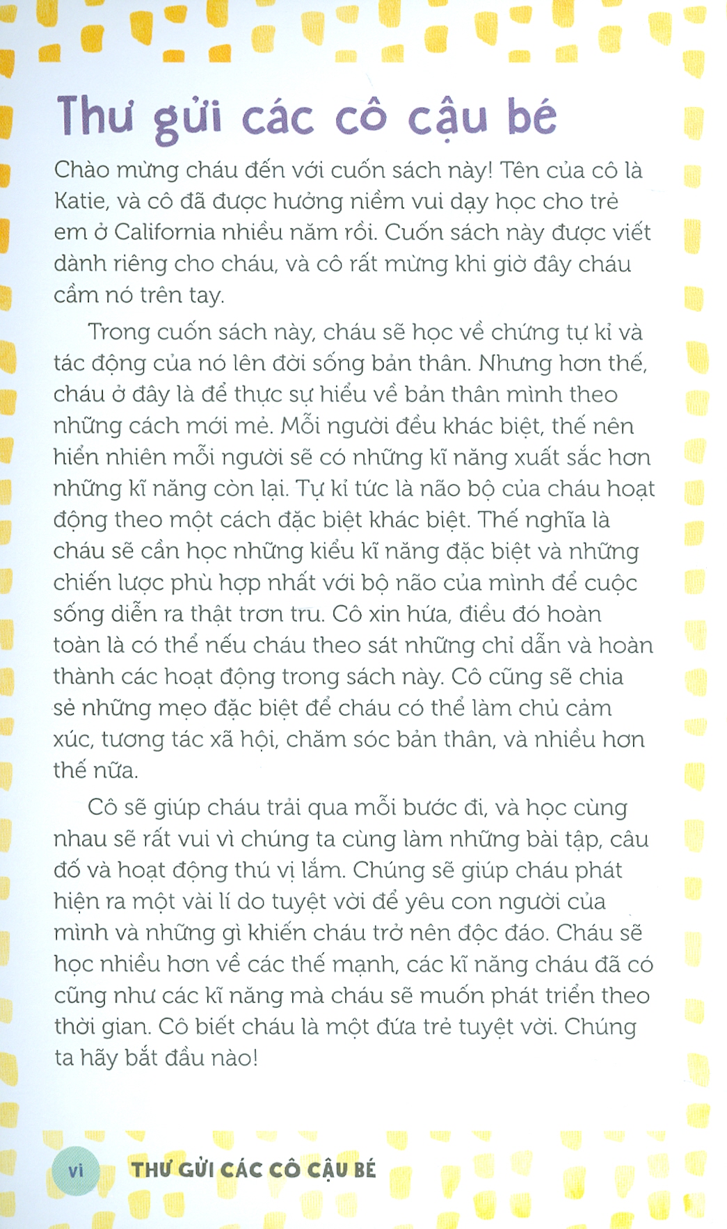 Mua tại TiktokTự kỉ là gì? Tác động của chứng tự kỉ lên đời sống như thế nào? Vì sao lại mắc chứng tự kỉ? – Đó là một phần trong cuốn sách Khác Biệt Cũng Là Điều Bình Thường - Chứng Tự Kỉ Và Tôi này. Mỗi người đều khác biệt, thế nên hiển nhiên mỗi người sẽ có những kĩ năng xuất sắc hơn những kĩ năng còn lại. Tự kỉ tức là não bộ của trẻ hoạt động theo một cách đặc biệt khác biệt, và do đó, cha mẹ cũng như con trẻ cần trang bị những bị những kiểu kĩ năng đặc biệt và những chiến lược phù hợp nhất để cuộc sống diễn ra thật trơn tru. Khác Biệt Cũng Là Điều Bình Thường - Chứng Tự Kỉ Và Tôi bao gồm 35 bài tập và câu hỏi tương tác nhằm giúp những trẻ mắc chứng tự kỉ có được sự tự tin và những kĩ năng cần thiết để hội nhập với thế giới xung quanh. Những hoạt động vui vẻ này cũng giúp trẻ có thể hiểu chứng tự kỉ rõ hơn, đồng thời học cách đón nhận một vài khía cạnh tự kỉ có thế mạnh. Hãy để cuốn sách Khác Biệt Cũng Là Điều Bình Thường - Chứng Tự Kỉ Và Tôi trở thành một phần của hành trình cả đời cho các bạn nhỏ mắc chứng tự kỉ cùng cha mẹ, để học về tự kỉ, vượt qua các trở ngại và sau cùng, trân trọng con người thực của trẻ tự kỉ. “Cuốn sách này là một phần của hành trình cả đời cho bạn và con bạn, để học về tự kỉ, vượt qua các trở ngại, và sau cùng, trân trọng con người thực của đứa trẻ. Tôi biết ơn bạn đã chọn cuốn sách này trên hành trình ấy.”- Katie Cook