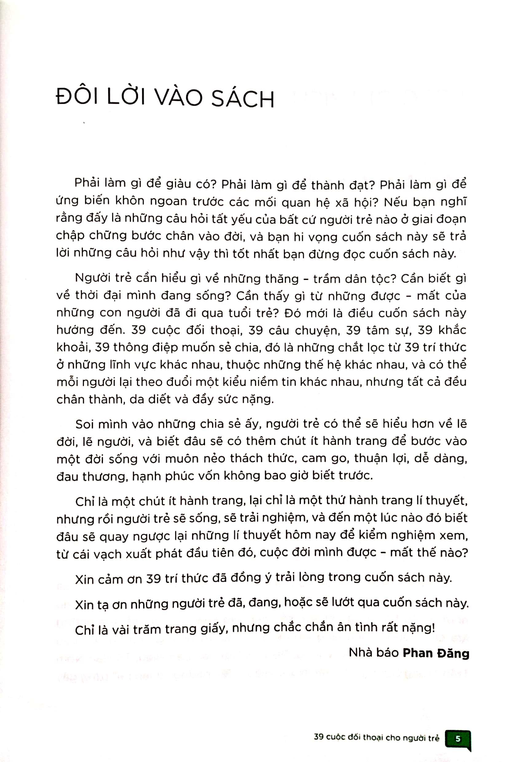 Câu trả lời chính là học hỏi kinh nghiệm và tiếp thu tri thức từ những bậc tiền bối đi trước. 39 Cuộc Đối Thoại Cho Người Trẻ là 39 câu chuyện, 39 tâm sự, 39 khắc khoải, 39 thông điệp muốn sẻ chia, được chắt lọc từ kinh nghiệm và vốn sống dạn dày của 39 trí thức trong những lĩnh vực khác nhau, thuộc nhiều thế hệ khác nhau. Tuy mỗi người theo đuổi một lĩnh vực tri thức khác nhau, nhưng tựu trung lại, tất cả đều bày tỏ niềm tin chân thành, da diết và đầy sức nặng.