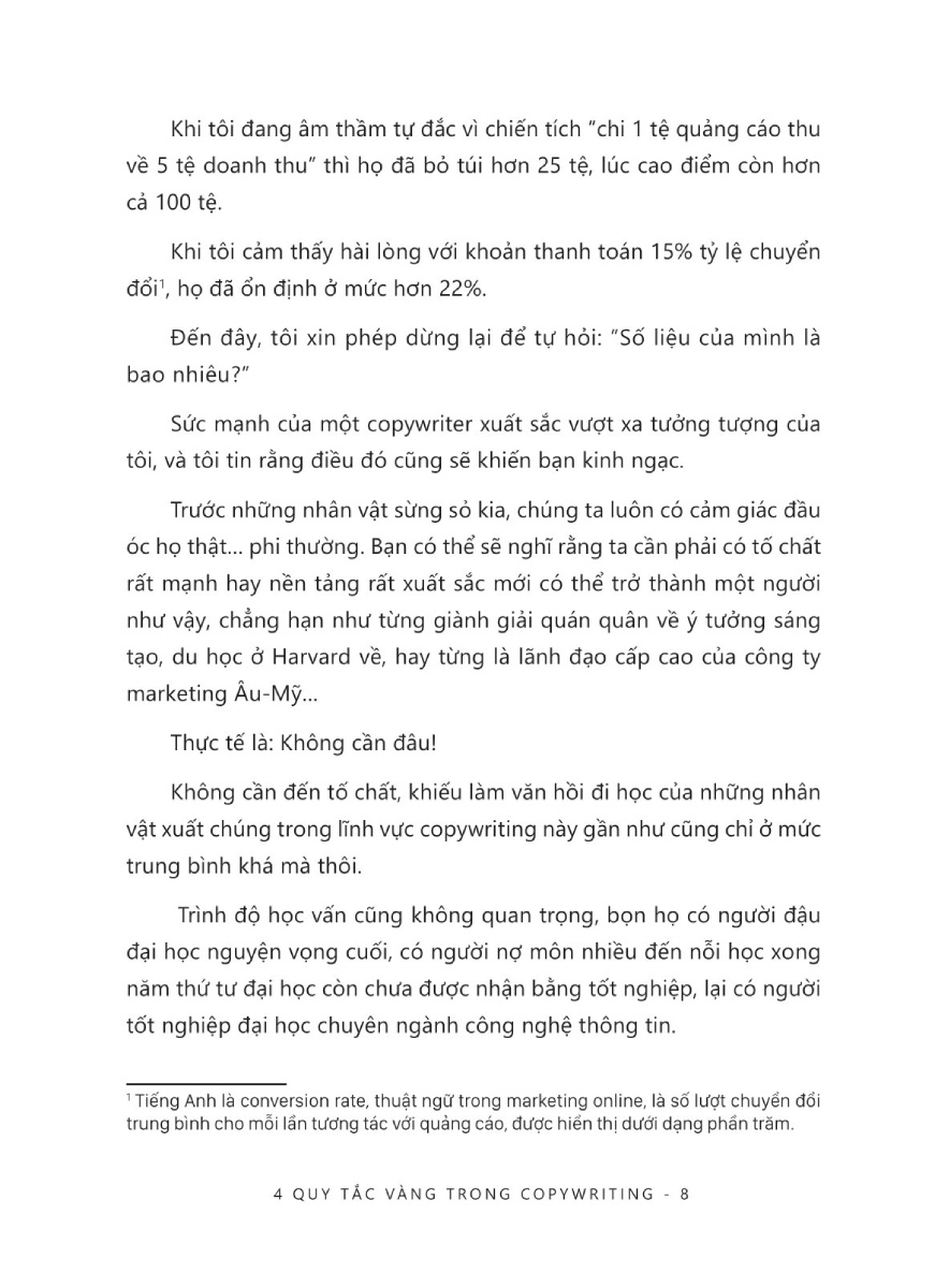 4 Quy Tắc Vàng Trong Copywriting Đã bao nhiêu lần bạn phải đối mặt với deadline cận kề mà “bí” ý tưởng viết? Trong đầu chỉ có câu chữ rập khuôn lối mòn, ý tưởng nhạt nhòa, sửa đến cả trăm lần nhưng vẫn không thể ra được một bài viết hoàn chỉnh ưng ý. Những điều đó cứ lặp đi lặp lại mỗi ngày cùng với việc chờ đợi một nguồn cảm hứng không bao giờ đến khiến bạn phải vò đầu bứt tai mà tự hỏi: “Làm thế nào để viết ĐỦ thông tin nhưng vẫn phải HAY trong khoảng thời gian có hạn?” Với 8 năm thực chiến trong lĩnh vực quảng cáo, viết hàng trăm content cho các tập đoàn cùng với những “bí kíp” trong nghề được chia sẻ bởi 6 marketer hàng đầu Trung Quốc, tác giả sẽ giúp bạn tạo ra bài viết hoàn hảo chỉ với 4 QUY TẮC VÀNG trong Copywriting: