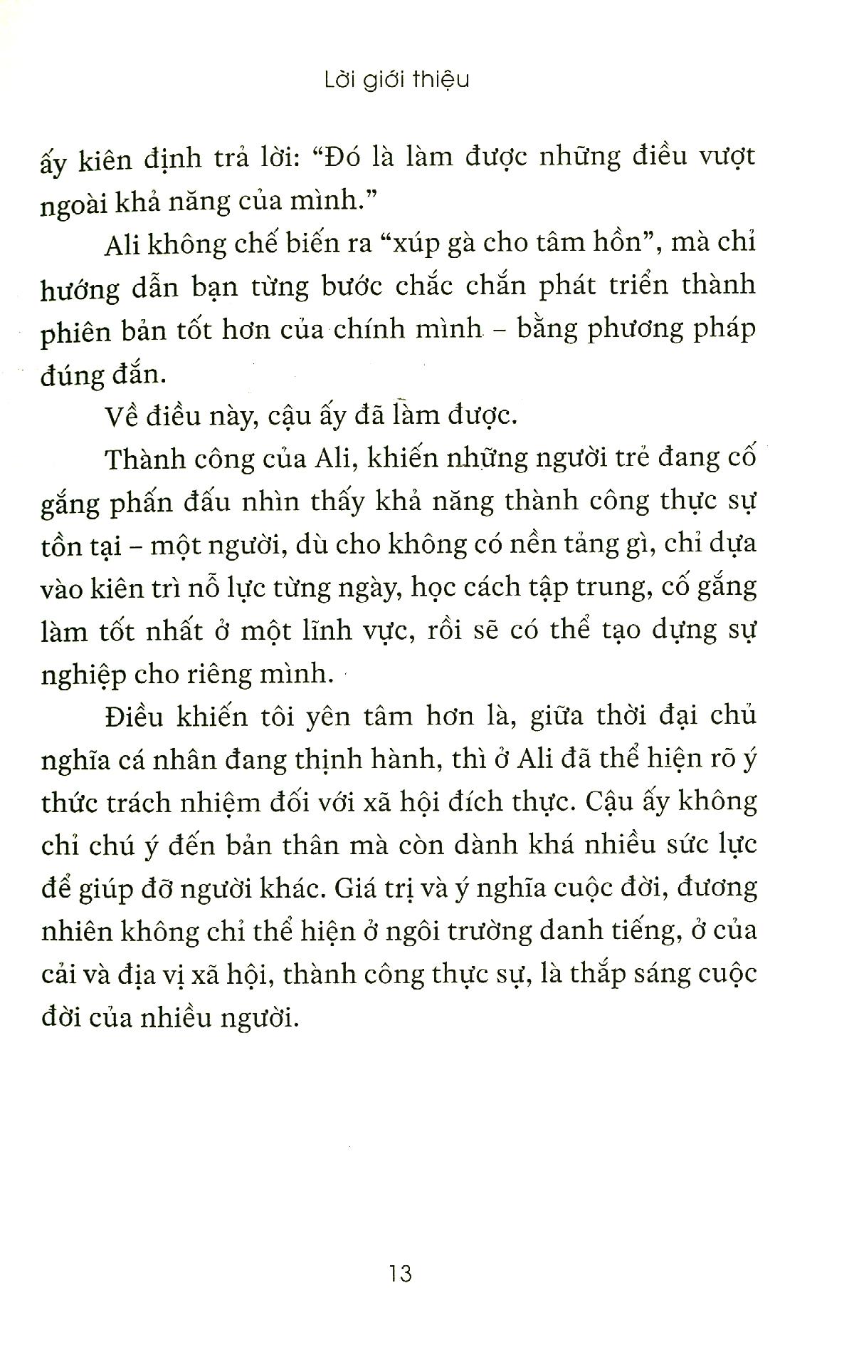 Ai cũng cần sức mạnh để lay động bản thân. Nhưng nếu một cuốn sách chỉ khiến bạn thấy cảm động, mà không dạy bạn về phương pháp, chứng tỏ nó chưa có ích nhiều cho bạn. Trong cuốn sách này, Ali đã mang tới nhiều phương pháp nhằm giúp bạn nâng cao chất lượng cuộc sống của m.ình, trong đó quan trọng nhất dường như là phương pháp quản lý thời gian cùng những công cụ được chứng minh có hiệu quả, có thể giúp ta vừa có đủ thời gian để nghỉ ngơi giải trí, vừa đảm bảo hoàn thành công việc và học tập trong khoảng thời gian ngắn nhất với chất lượng cao. Qua từng chương sách, bạn có thể bước từng bước nhỏ vững vàng, dần dần đi được xa hơn, đến gần hơn với ước mơ của m.ình.