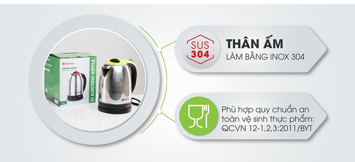 - Thân ấm được làm bằng Inox 304 cao cấp 2 lớp có tính thẩm mĩ cao và không phản ứng hóa học dù ở nhiệt độ cao và an toàn thực phẩm cho người sử dụng