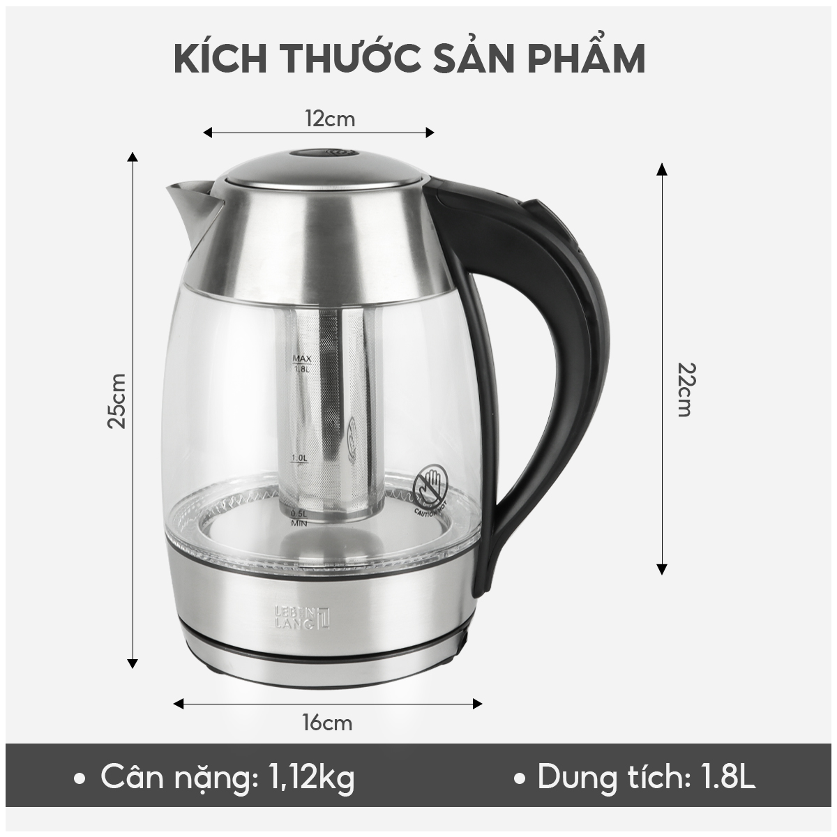 Ấm siêu tốc, bình thủy tinh Lebenlang LBLB2226 có lõi lọc trà, 2200W, 1800ml, bảo hành 2 năm - hàng chính hãng