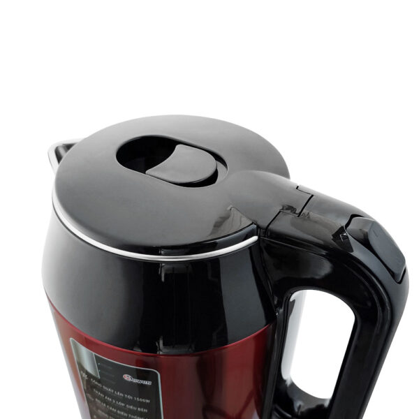 Dung tích: 1.7L Công suất: 1800W Ưu điểm nổi bật: 2 lớp cách nhiệt: Thép không gỉ bên trong, nhựa mát tay bên ngoài – an toàn tuyệt đối, nhất là với gia đình có