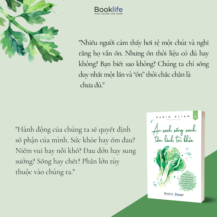 Trong Ăn sạch sống xanh, tâm lành trí khỏe, Darin Olien cung cấp cho chúng ta một cách suy nghĩ hoàn toàn mới về sức khỏe và hạnh phúc bằng cách xác định các động lực sống: Dinh dưỡng chất lượng, Hydrat hóa, Giải độc, Oxy hóa và Kiềm hóa, cho chúng ta biết cách duy trì cân nặng hợp lý, ngăn ngừa ngay cả những căn bệnh nghiêm trọng nhất. Chúng ta luôn được dạy phải xem máu, xương, da, các cơ quan, các nơ-ron thần kinh và tất cả mọi thứ khác một cách riêng rẽ và mỗi bộ phận lại mang đến những vấn đề hay mối lo ngại không giống nhau. Nhưng sự thật là, mỗi một bộ phận nhỏ nhất bên trong cơ thể người, mọi phân tử và tế bào đều phản ứng với năm sinh lực của cuộc sống kể trên. Việc ta cần làm chỉ là làm sao nắm bắt những yêu cầu đó - năm sinh lực của cuộc sống. Và sau đó, ta phải cố gắng hết sức để hoàn thành.