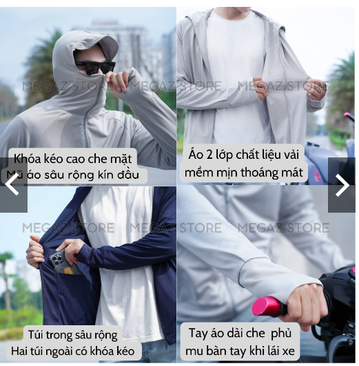 - Áo có mũ đội che kín đầu và tay áo xỏ ngón che hết mu bàn tay, dễ dàng lái xe, có túi ngoài & túi trong tiện lợi