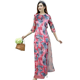 Chất liệu: Vải lụa ý chính phẩm hoạ tiết 6D Màu sắc: có 2 màu Hồng + Tím Đủ size: M-L-XL-XXL-XXXL Phù hợp: từ 44kg - 75kg Kiểu dáng: Set áo dài, bao gồm: Áo