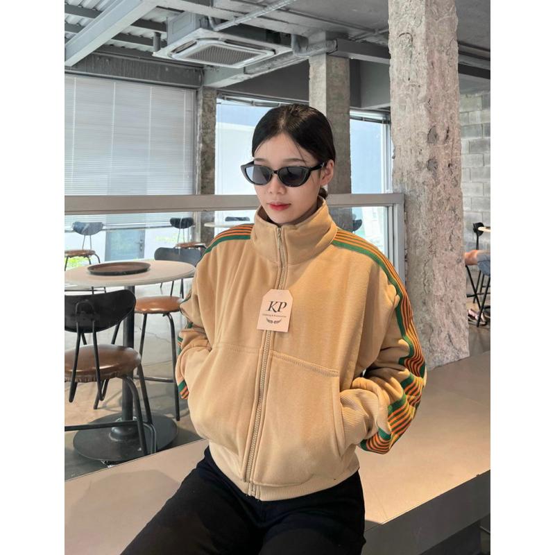Áo khoác nữ nỉ chống nắng Viền Sọc Cổ Trụ Dáng Lửng là một lựa chọn thời trang cực hót cho các cô gái. Thiết kế cổ trụ và viền sọc tinh tế, sản phẩm