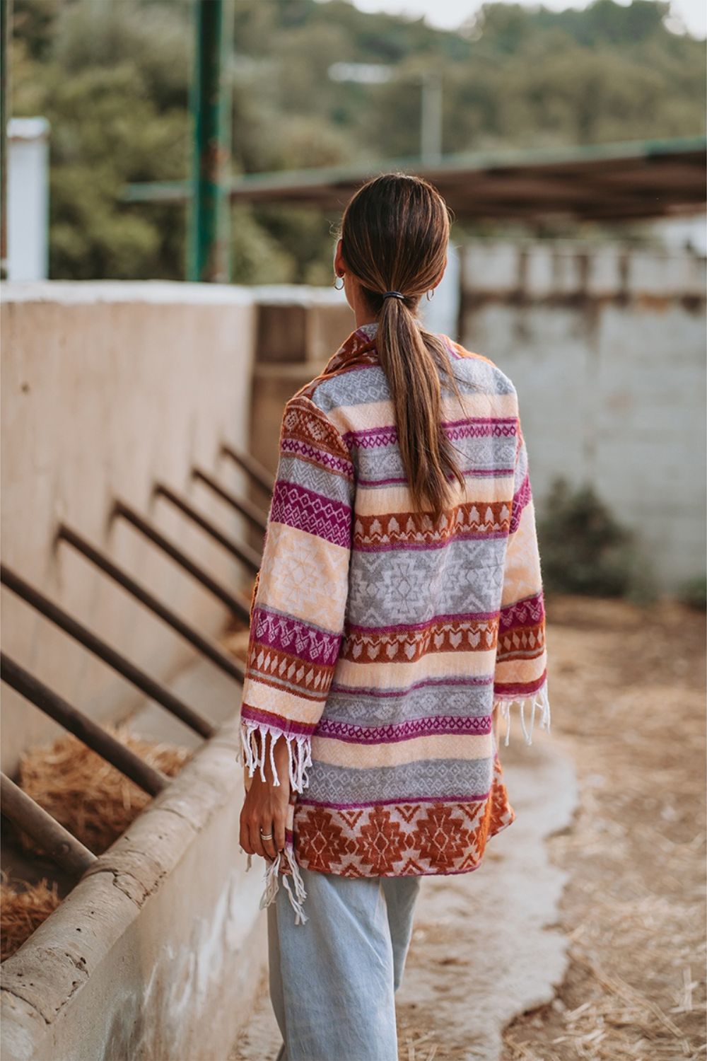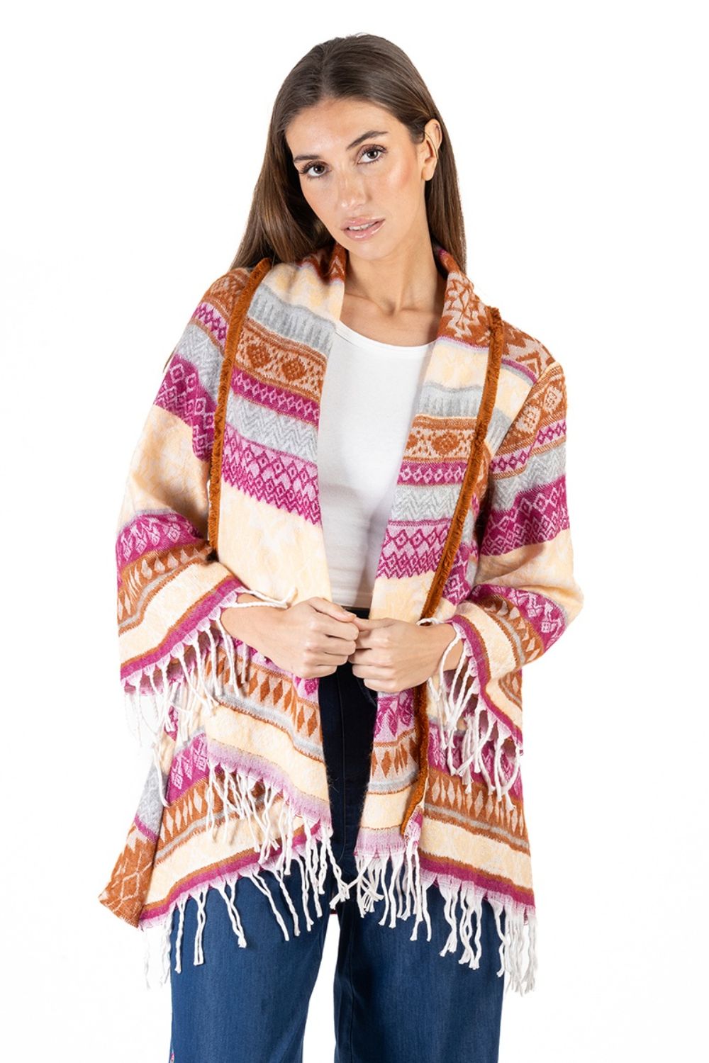 Áo Khoác Isla Bonita, kiểu áo choàng thu đông, không nút cài, họa tiết thổ cẩm độc đáo. Chất vải giống vải bố. Freestyle. Dài áo thân trước 70cm, thân sau 90cm. (50x90cm)Phù hợp đi