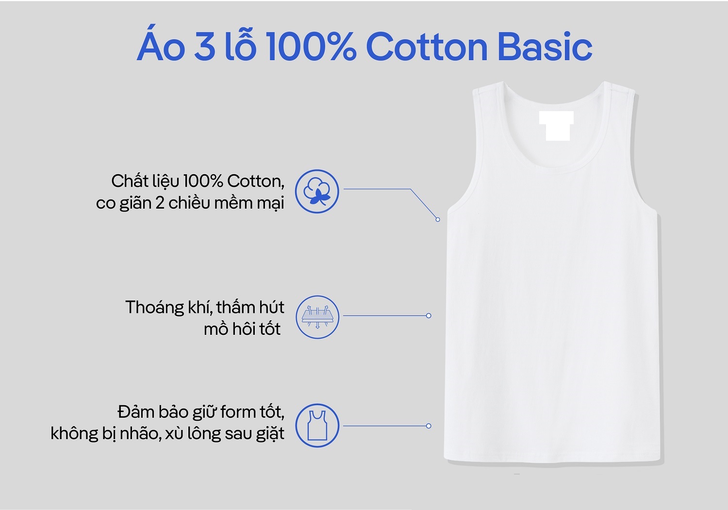 CHI TIẾT SẢN PHẨM: – Áo Ba lỗ 100% cotton kiểu dáng basic. – Chất liệu Cotton tự nhiên mềm mịn, mang đến bề mặt dễ chịu, mượt và nhẹ, đặc biệt không bai dão.