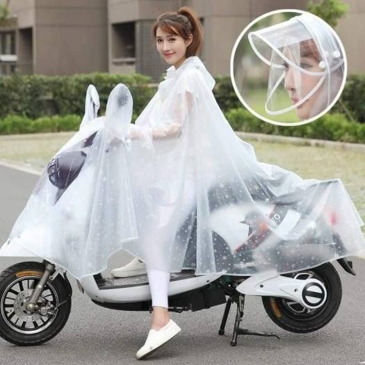 - Áo mưa thiết kế màu trắng trong suốt, có khẩu trang tiện lợi cùng tay cánh dơi rộng rãi giúp che mưa hiệu quả mà không vướng víu khi chạy xe. - Được làm