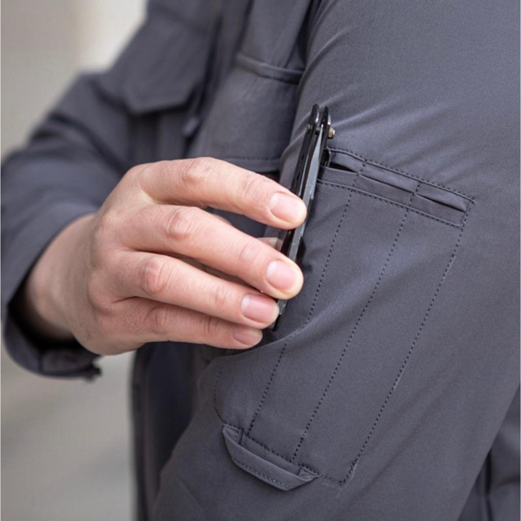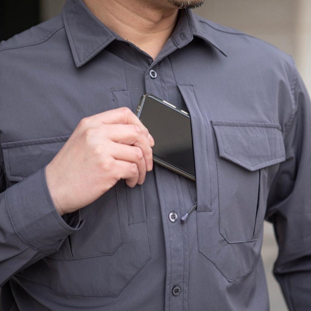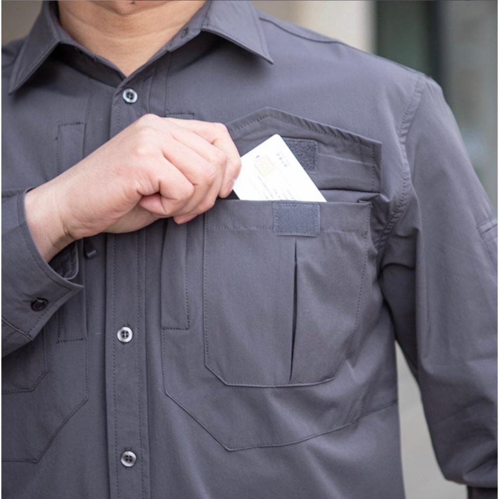 Áo sơ mi chiến thuật co giãn_nhanh khô được chế tạo đến 4 ngăn túi áo, được chia gồm 2 túi áo ngực và 1 túi bắp tay. Với túi áo ngực được thiết kế 2 túi 2 bên, tạo cho người dùng nhiều sự lựa chọn cất đồ hơn. Tại miệng túi đựng được gia cố thêm miếng đính dán cố định, giúp bảo vệ đồ đạc bên trong không bị rơi rớt ra ngoài. Đặc biệt có thêm ngăn truy cập nhanh ở phần ngực áo giúp bạn lấy nhữ loại giấy tờ, vật dụng cấp thiết nhanh chóng.