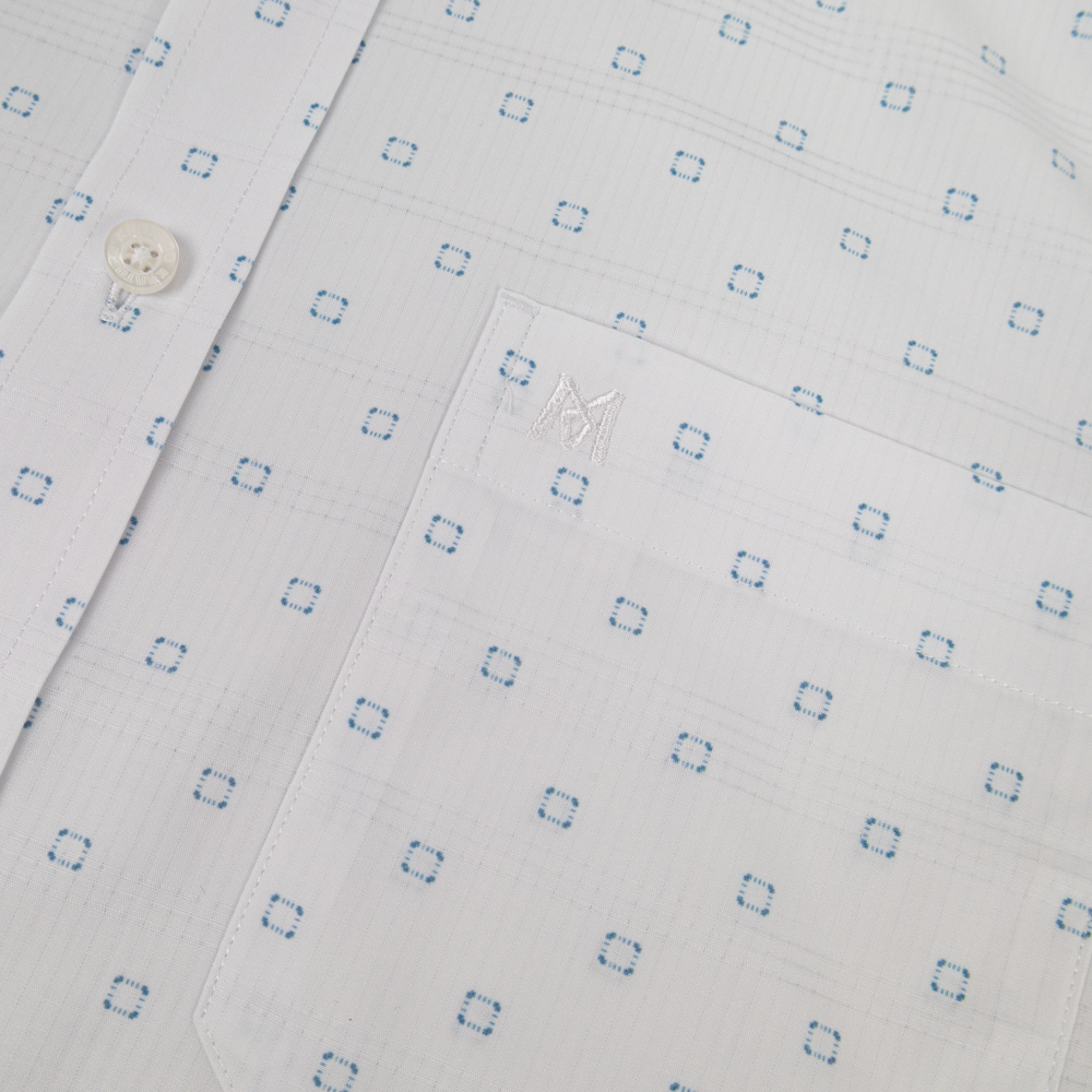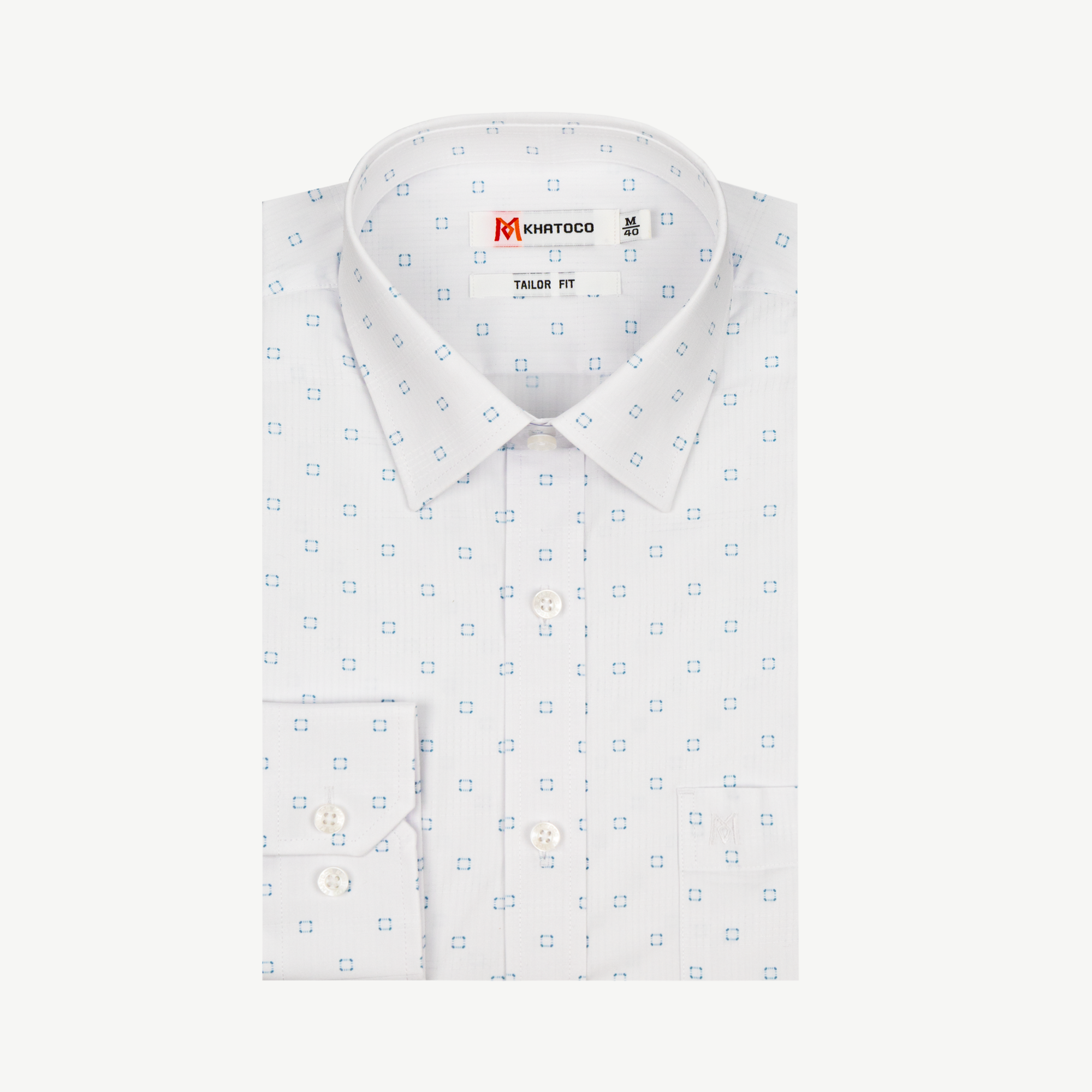 (V) MÔ TẢ: Form Taylor, tai dài   Form áo tiêu chuẩn với form áo rộng vừa phải, không ôm sát cơ thể, bó nhẹ ở vùng eo và tay áo. Độ rộng vùng ngực và nách cũng sẽ fit hơn với cơ thể. Không quá rộng như form áo cổ điển.   Màu vải nhã nhặn và trung tính dễ dàng phối trang phục tạo sự lịch lãm, nam tính   Nút ton-sur-ton khắc logo đẹp mắt phối trọn vẹn màu áo.   Logo thêu sắc nét trên túi áo.  Chất liệu:50%POLYESTER- 24%COTTON-2%SPANDEX- 24%VISCOSE(BAMBOO) |Mềm mịn|Thấm hút |Kháng khuẩn|Độ thoáng khí cao|Chống tia UV|Chống nhăn|Chống co rút |Nhanh khô|Dễ vệ sinh làm sạch|Đứng phom áo Màu sắc : Màu Xanh họa tiết