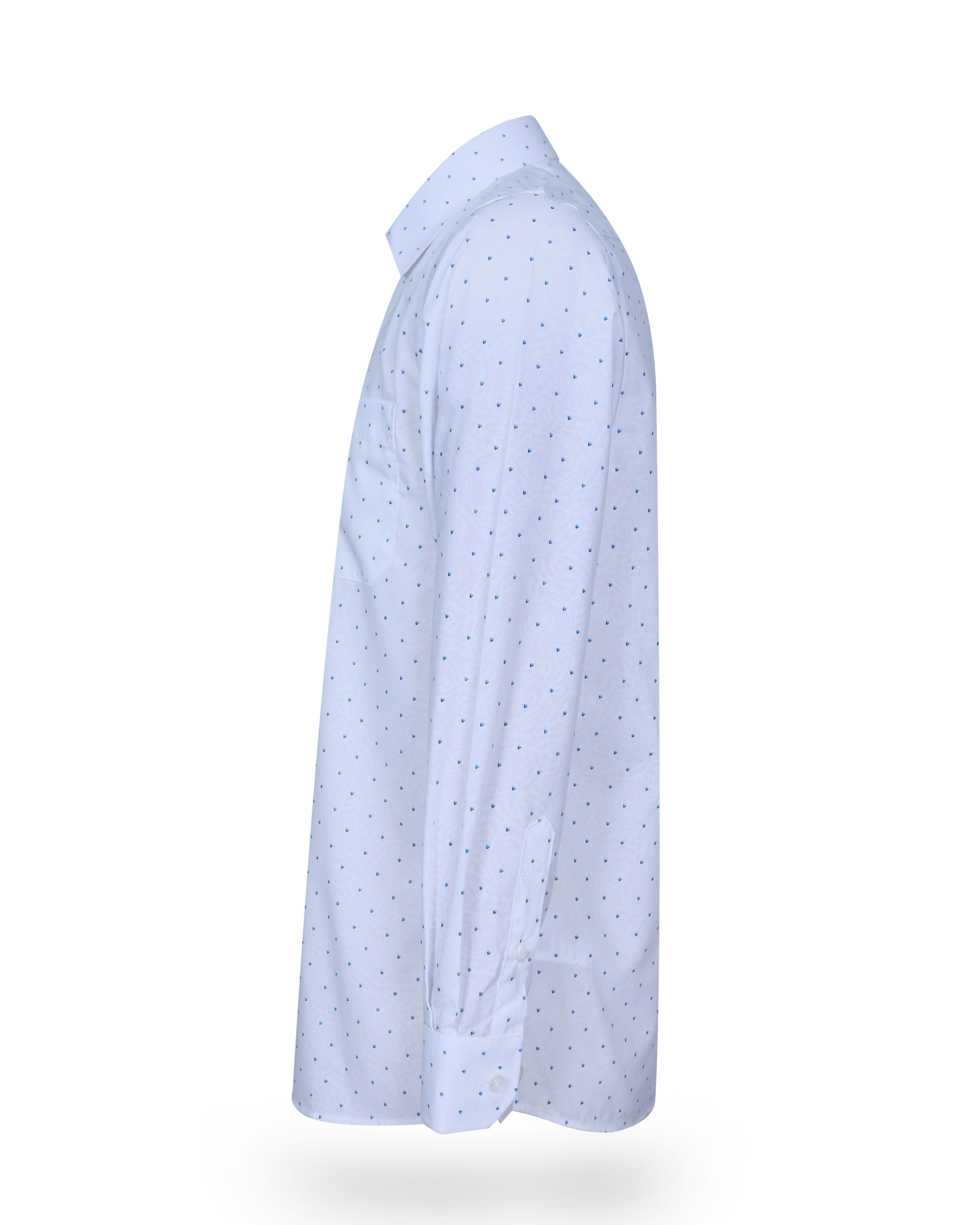 (V) MÔ TẢ: Form Taylor, tai dài   Form áo tiêu chuẩn với form áo rộng vừa phải, không ôm sát cơ thể, bó nhẹ ở vùng eo và tay áo. Độ rộng vùng ngực và nách cũng sẽ fit hơn với cơ thể. Không quá rộng như form áo cổ điển.   Màu vải nhã nhặn và trung tính dễ dàng phối trang phục tạo sự lịch lãm, nam tính   Nút ton-sur-ton khắc logo đẹp mắt phối trọn vẹn màu áo.   Logo thêu sắc nét trên túi áo.  Chất liệu:50%POLYESTER- 24%COTTON-2%SPANDEX- 24%VISCOSE(BAMBOO) |Mềm mịn|Thấm hút |Kháng khuẩn|Độ thoáng khí cao|Chống tia UV|Chống nhăn|Chống co rút |Nhanh khô|Dễ vệ sinh làm sạch|Đứng phom áo Màu sắc : Màu Xanh họa tiết