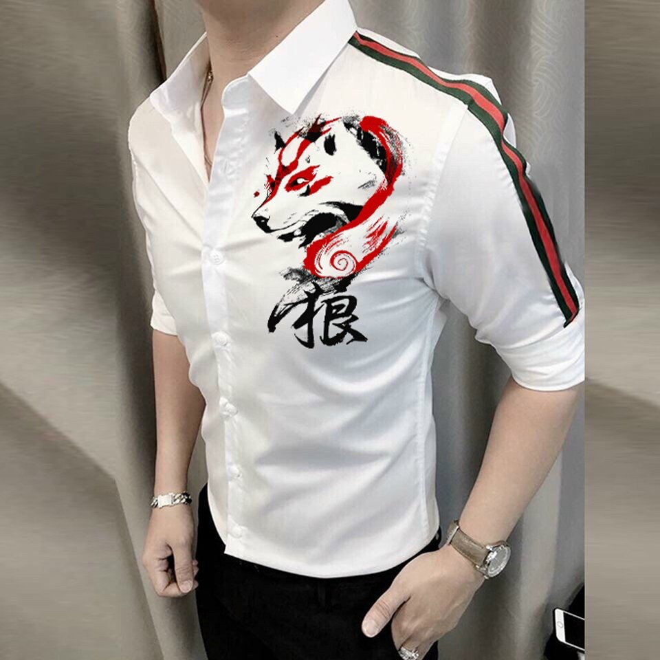 Thiết kế Áo sơ mi nam viền vai xanh đỏ họa tiết sói cao cấp phong cách đường may tỉ mỉ.