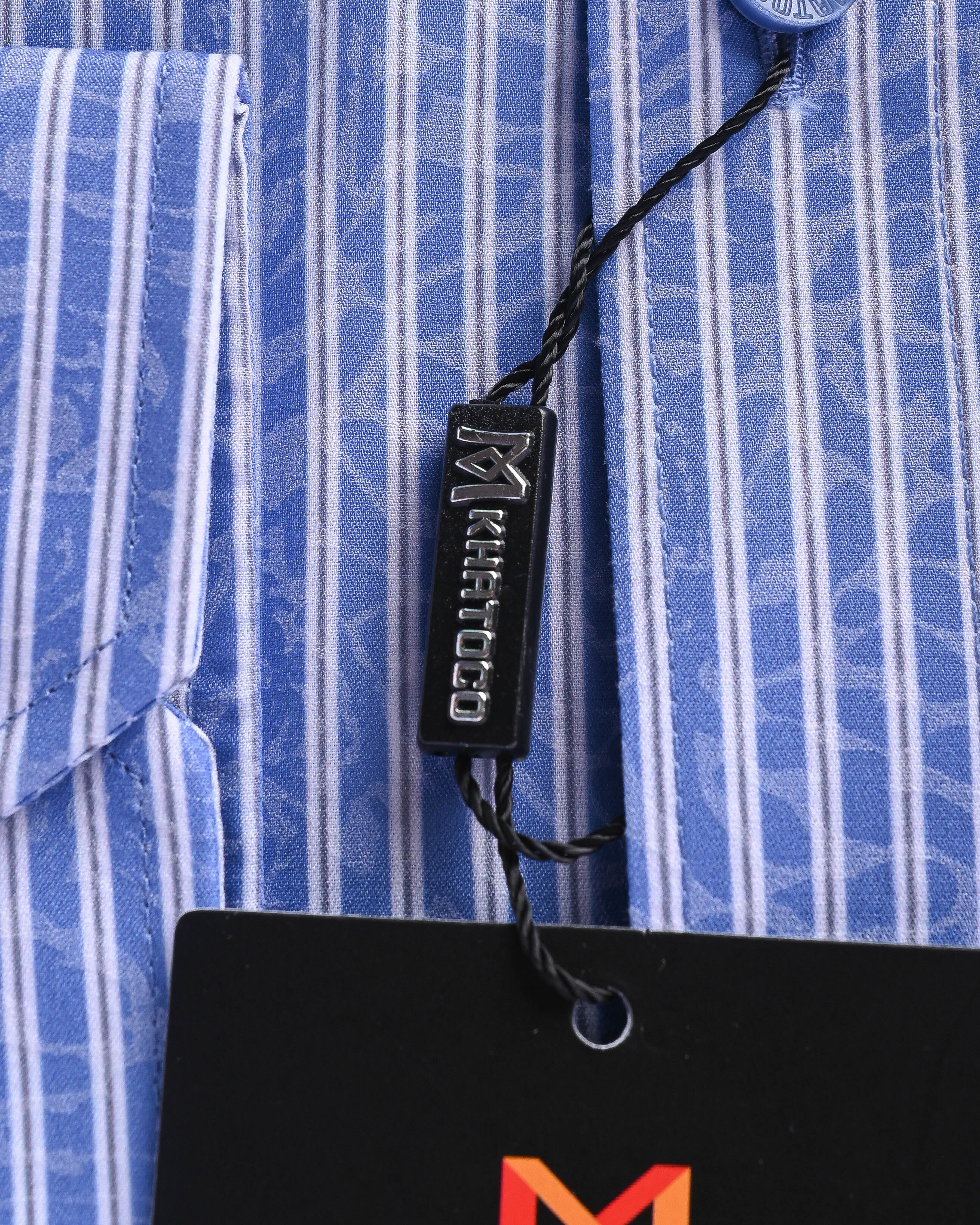 (V) MÔ TẢ: Form Taylor, tai dài   Form áo tiêu chuẩn với form áo rộng vừa phải, không ôm sát cơ thể, bó nhẹ ở vùng eo và tay áo. Độ rộng vùng ngực và nách cũng sẽ fit hơn với cơ thể. Không quá rộng như form áo cổ điển.   Màu vải nhã nhặn và trung tính dễ dàng phối trang phục tạo sự lịch lãm, nam tính   Nút ton-sur-ton khắc logo đẹp mắt phối trọn vẹn màu áo.   Logo thêu sắc nét trên túi áo.  Chất liệu:50%POLYESTER- 24%COTTON-2%SPANDEX- 24%VISCOSE(BAMBOO) |Mềm mịn|Thấm hút |Kháng khuẩn|Độ thoáng khí cao|Chống tia UV|Chống nhăn|Chống co rút |Nhanh khô|Dễ vệ sinh làm sạch|Đứng phom áo Màu sắc : Màu Xanh họa tiết