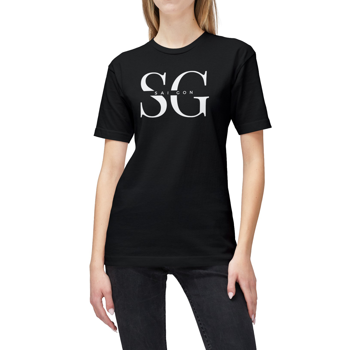 - Chữ "SG SAI GON" được in ở phía trước của áo thun, tạo điểm nhấn rõ ràng và đặc biệt. Bằng cách này, áo thun không chỉ là một món đồ phục vụ nhu cầu thời trang mà còn là một cách để thể hiện tình yêu và tự hào đối với thành phố Sài Gòn.