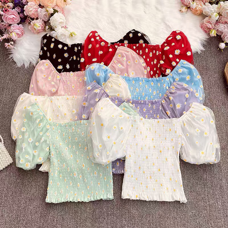 - Áo kiểu crotop phần thân áo bo chun co giãn, tay phồng mix chất voan lưới siêu xịn xò. Áo với họa tiết cúc họa mi xinh xắn đang được lòng phái đẹp. Sắm ngay một chiếc về đi dạo, cà phê với bạn bè hay du lịch sống ảo đều xinh lung linh ạ!