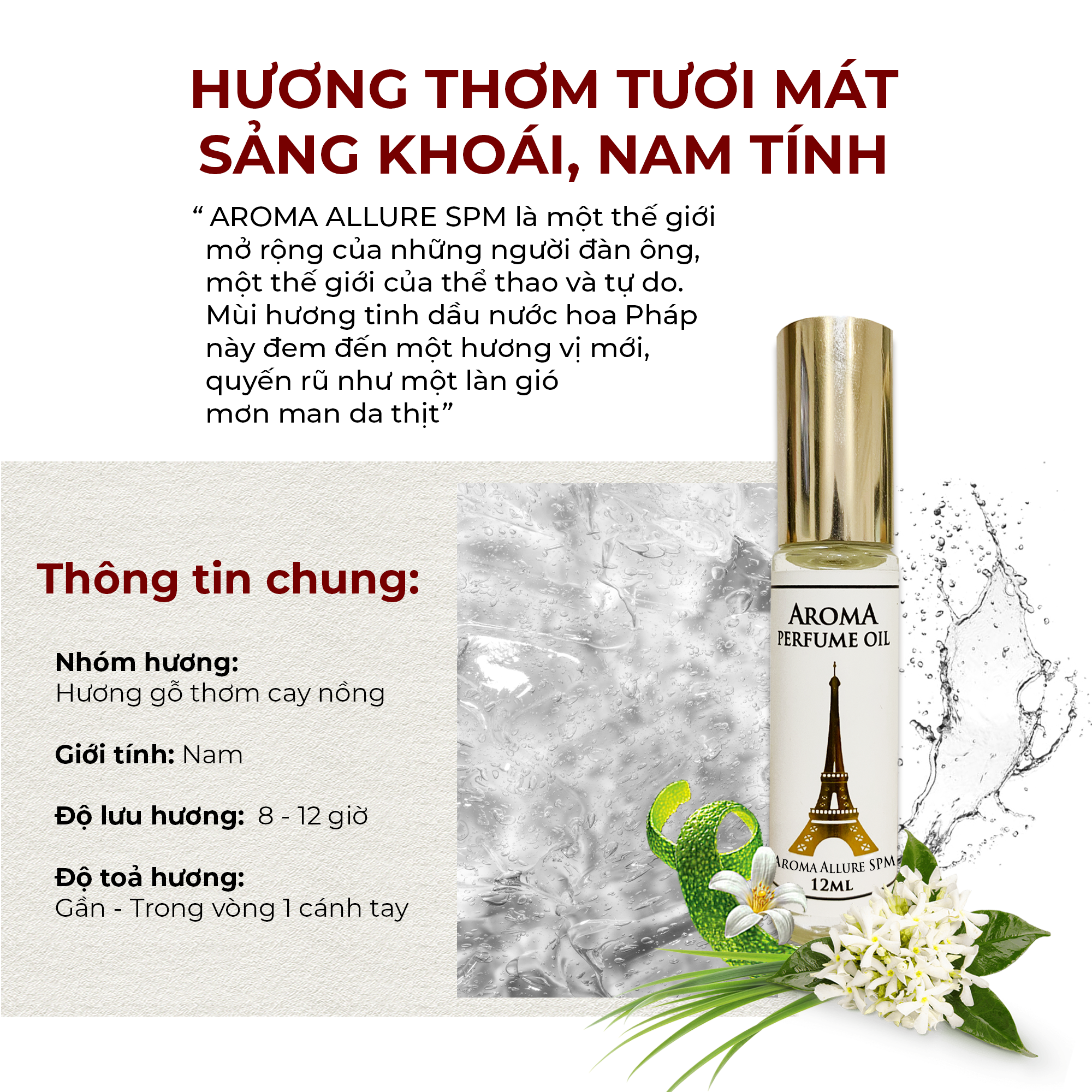 Tinh dầu nước hoa Pháp cao cấp Aroma Allure SPM có mùi hương đặc biệt tạo sự quyến rũ, gợi cảm, đồng thời mang đến một cảm nhận đầy thú vị cho người dùng. Chọn Aroma để trải nghiệm ngay chai tinh dầu nước hoa Pháp đình đám này!