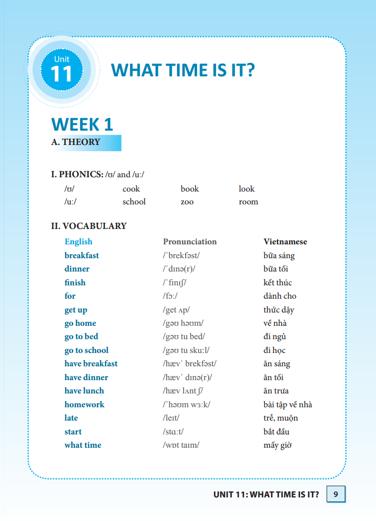 Phần Week 1: Tập trung vào việc thực hành kiến thức ngôn ngữ của các em. Các em sẽ được rèn luyện ngữ âm, từ vựng và ngữ pháp/ mẫu câu trong phần này.