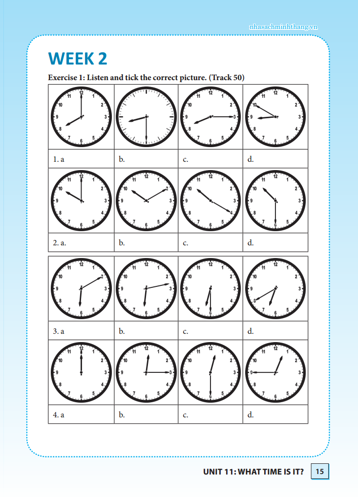 - Phần Week 1: Tập trung vào việc thực hành kiến thức ngôn ngữ của các em. Các em sẽ được rèn luyện ngữ âm, từ vựng và ngữ pháp/ mẫu câu trong phần này.