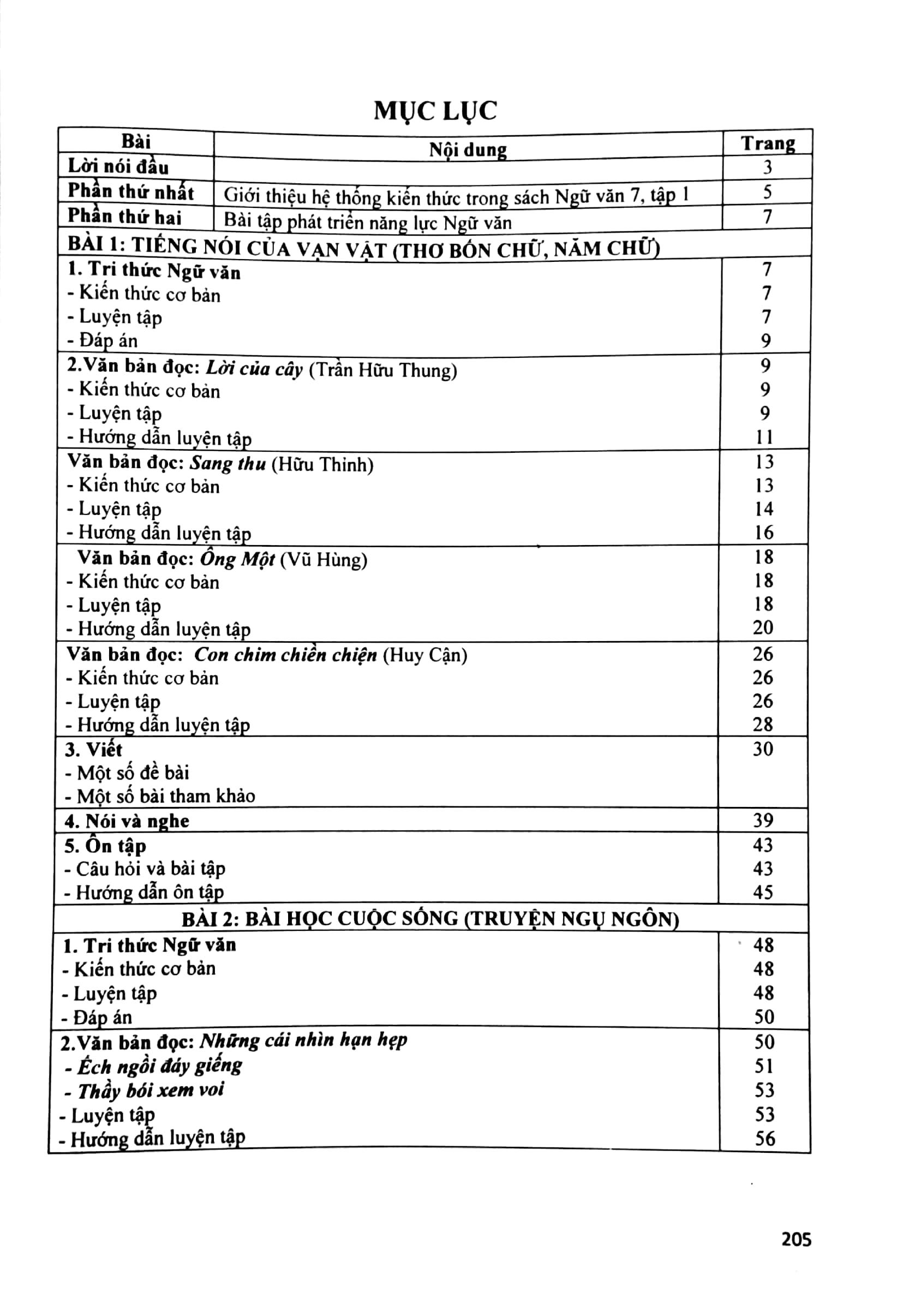 - Phần thứ hai: Tóm tắt kiến thức cơ bản và hệ thống câu hỏi trắc nghiệm và bài tập tự luận của các bài học có trong Sách giáo khoa Ngữ văn 7, tập 1. Phần này, được biên soạn theo các mục: “Kiến thức cơ bản”, “Luyện tập”, “Hướng dẫn luyện tập”. Mục “Kiến thức cơ bản” là các nội dung bắt buộc học sinh phải ghi nhớ, phải nắm chắc, để vận dụng một cách hiệu quả trong khi làm bài tập. I. Mục “Luyện tập” bao gồm các câu hỏi trắc nghiệm, bài tập tự luận và hướng dẫn luyện tập. Phần “Câu hỏi và bài tập” là hệ thống câu hỏi trắc nghiệm và bài tập tự luận được biên soạn bám sát các câu hỏi trong sách giáo khoa, có mở rộng, nâng cao theo các kỹ năng đọc, viết, nói và nghe. Phần “Hướng dẫn luyện tập” là các gợi ý, chỉ dẫn để học sinh kiểm tra lại kết quả các bài tập các em đã làm. Đặc biệt, với dạng bài tập rèn kỹ năng viết, chúng tôi cung cấp thêm một số đoạn văn, bài văn để học sinh tham khảo. Thông qua các câu hỏi trong “Phiếu học tập”của các dạng bài tập này, chúng tôi mong muốn các em đọc hiểu, rút ra được bài học về cách làm các kiểu bài (Làm một bài thơ bốn chữ hoặc năm chữ; Viết đoạn văn ghi lại cảm xúc về một bài thơ bốn chữ hoặc năm chữ Viết bài văn kể lại sự việc có thật liên quan đến nhân vật hoặc sự kiện lịch sử, Viết bài văn phân tích đặc điểm nhân vật trong tác phẩm văn học; Viết bài văn biểu cảm về con người, sự việc; Viết bài văn thuyết minh về một quy tắc hay luật lệ trong hoạt động phù hợp với các lứa tuổi và trình độ. Với nội dung và cấu trúc nêu trên, chúng tôi hy vọng cuốn sách sẽ giúp các thầy cô giáo, các bậc phụ huynh và các em học sinh có thêm một tài liệu tham khảo hữu ích, đáp ứng yêu cầu đổi mới dạy học theo định hướng phát triển năng lực. Tuy nhiên, cuốn sách khó tránh khỏi một số hạn chế, thiếu sót. Nhóm tác giả rất mong nhận được các ý kiến đóng góp để cuốn sách hoàn thiện hơn trong những lần tái bản. Chúng tôi xin chân thành cảm ơn các tác giả có bài viết tư liệu được đưa vào sách này.