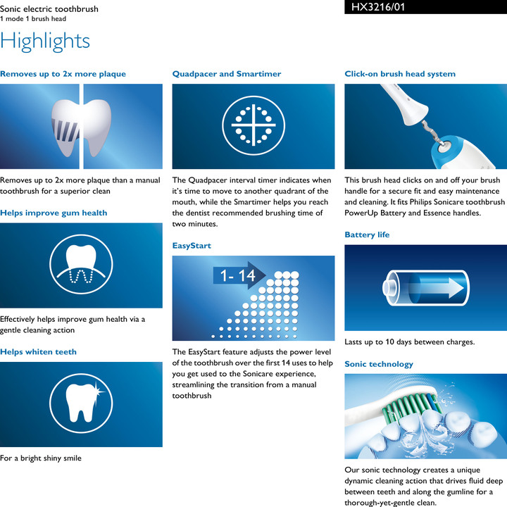Bàn chải đánh răng điện Philips HX3216 - Hàng nhập khẩu Philips Sonicare đã nghiên cứu và phát triển các công nghệ tốt nhất dành cho bàn chải điện. Dưới đây là các tính năng đặc