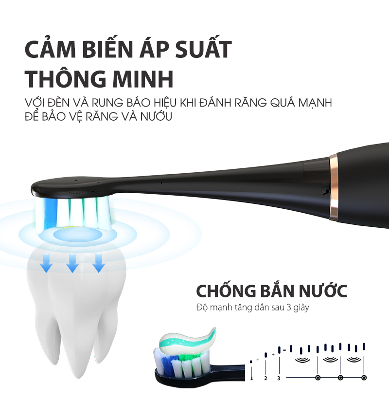 Lorca TA-9208TB còn nổi bật với 15 chế độ chải răng cùng 3 mức cường độ, phù hợp với mọi nhu cầu chăm sóc răng miệng. Thiết bị tích hợp tính năng ghi nhớ chế độ sử dụng gần nhất và chu trình chải 2 phút theo khuyến nghị của nha sĩ, giúp bạn tối ưu hóa việc làm sạch răng miệng.