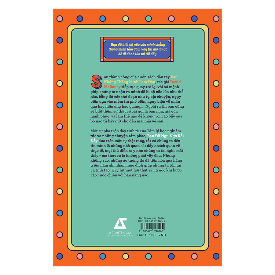 Bạn Đỡ Ngu Ngơ Rồi Đấy Sau thành công của cuốn sách tâm lý học gây chấn động năm 2017 Bạn Không Thông Minh Lắm Đâu, tác giả David McRaney sẽ quay trở lại với chúng ta trong năm nay với một tác phẩm nặng ký không kém – Bạn Đỡ Ngu Ngơ Rồi Đấy. Là một sự pha trộn đầy tinh tế giữa công cuộc nghiên cứu khoa học nghiêm túc và hàng tá những câu chuyện tầm phào, cuốn sách này sẽ một lần nữa lật tẩy những thủ đoạn tráo trở mà bộ não trong hộp sọ vẫn đang hàng ngày sử dụng để đánh lừa bạn. Từ ngụy biện dựa vào niềm tin phổ biến cho tới hiệu ứng phản tác dụng, hãy cùng tìm hiểu về 19 hiện tượng tâm lý lúc nào cũng tồn tại trong bạn dù bạn có nhận ra hay không. Ngoài ra, bạn cũng sẽ được biết thêm sự thật về cái gọi là bản ngã, cùng tính toán để tìm ra cái giá của hạnh phúc, và khám phá ra cách để không rơi vào bẫy của bộ não từ bây giờ cho đến mãi mãi về sau. Bạn đã biết rằng bộ não của mình chẳng thông minh lắm đâu, vậy thì giờ là lúc để đi đánh lừa nó rồi đấy. Hãy hít một hơi thật sâu trước khi bước vào cuộc chiến với bản năng nào.