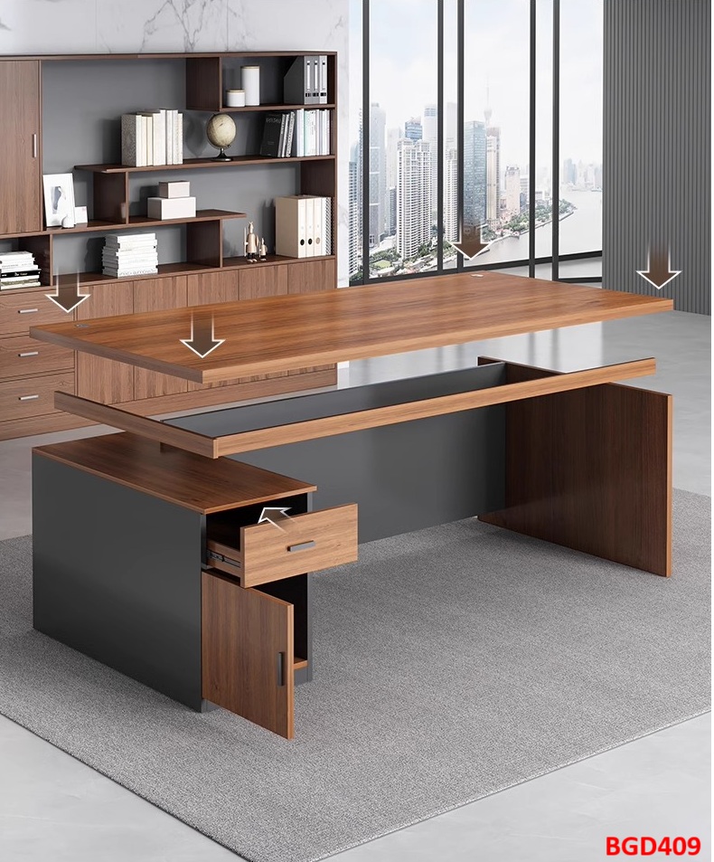 Tiện ích đi kèm: Nhiều bàn giám đốc tích hợp các ngăn kéo, kệ tài liệu, hộc tủ hoặc khe cắm dây điện, giúp sắp xếp gọn gàng.