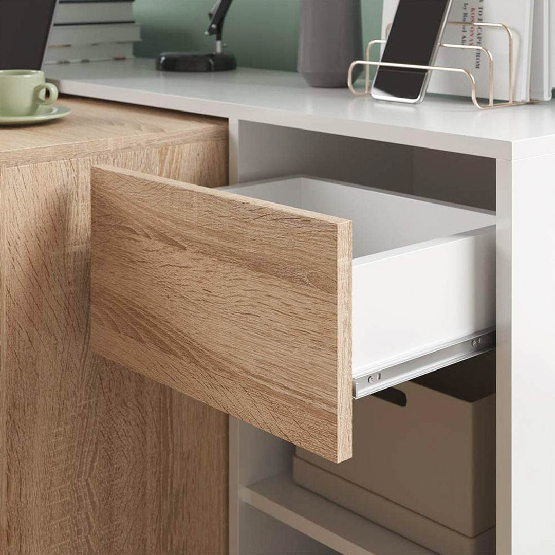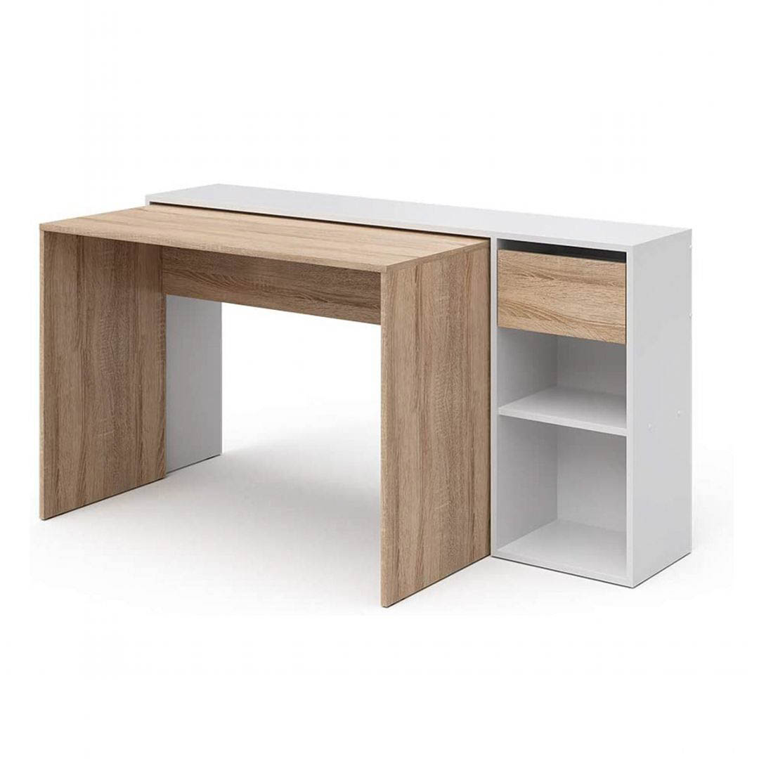 - Tên sản phẩm: Bàn làm việc kèm ngăn kéo và kệ để đồ - Chất liệu: Gỗ MDF phủ melamine cao cấp chống xước - chân bàn gỗ tự nhiên - Màu sắc: Vân gỗ sồi - Kích thước: 80/120 x 55 x 82cm (dài x rộng x cao) - Công năng: Là mẫu bàn làm việc, bàn học giúp tiết kiệm diện tích không gian phòng