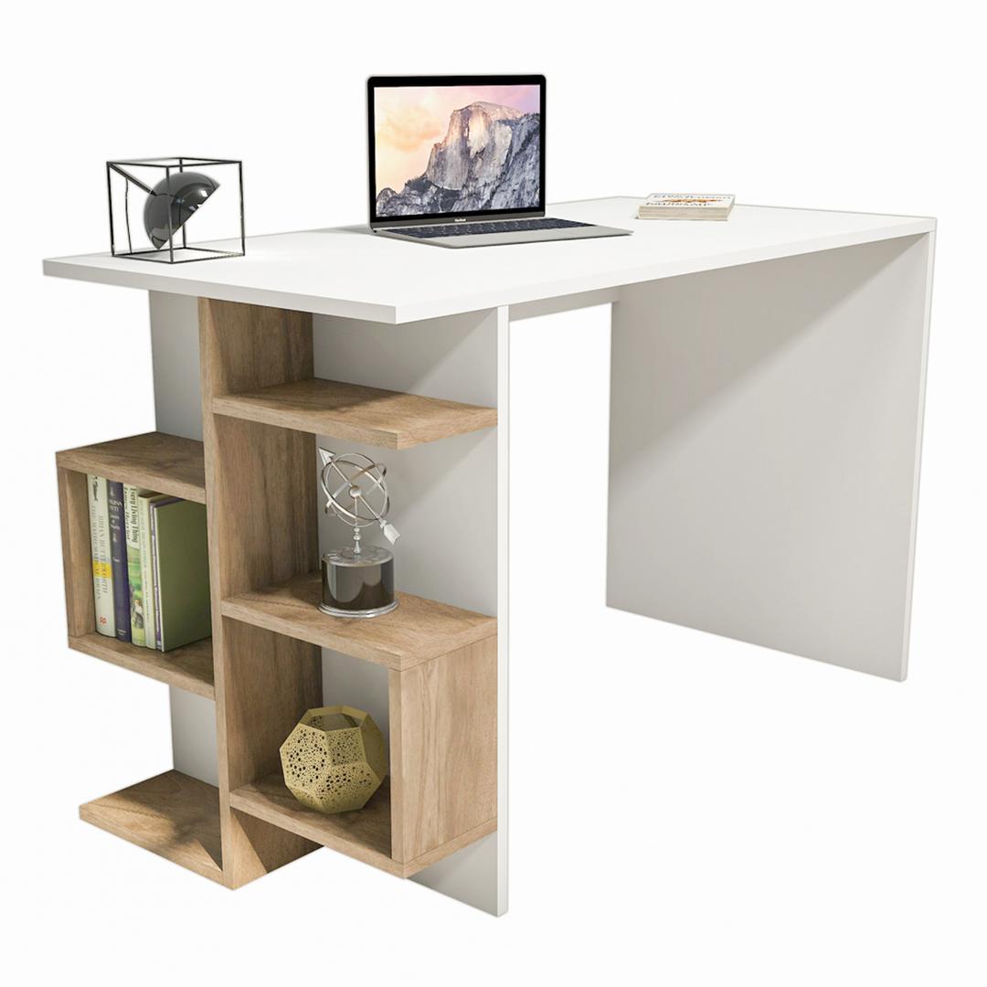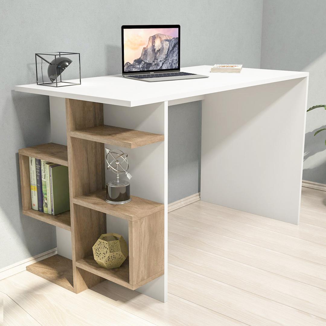 - Tên sản phẩm: Bàn làm việc IGA kèm kệ sách decor phong cách minimalism - Màu sắc: Trắng - Chất liệu: Chân thép phủ sơn tĩnh điện, mặt gỗ mdf phủ melamin chống xước