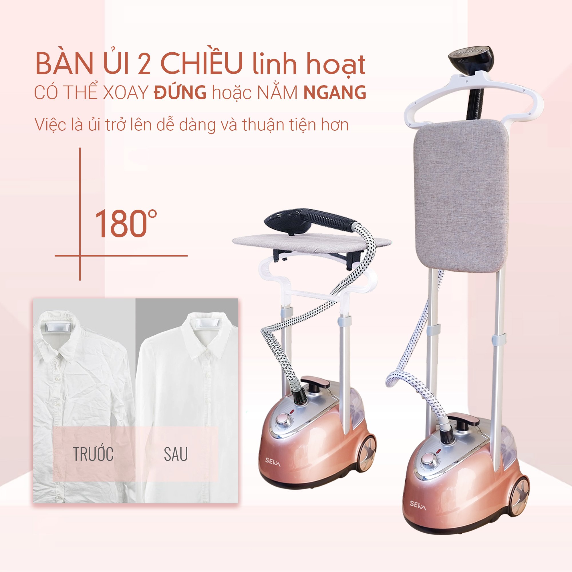 - Móc treo quần áo tích hợp: Móc treo quần áo tích hợp giúp bạn dễ dàng treo những trang phục như áo, váy, quần trong khi dùng bàn ủi - Thiết kế gọn nhẹ dễ dàng sử dụng và bảo quản. Thông tin sản phẩm bàn là cây hơi nước SEKA: