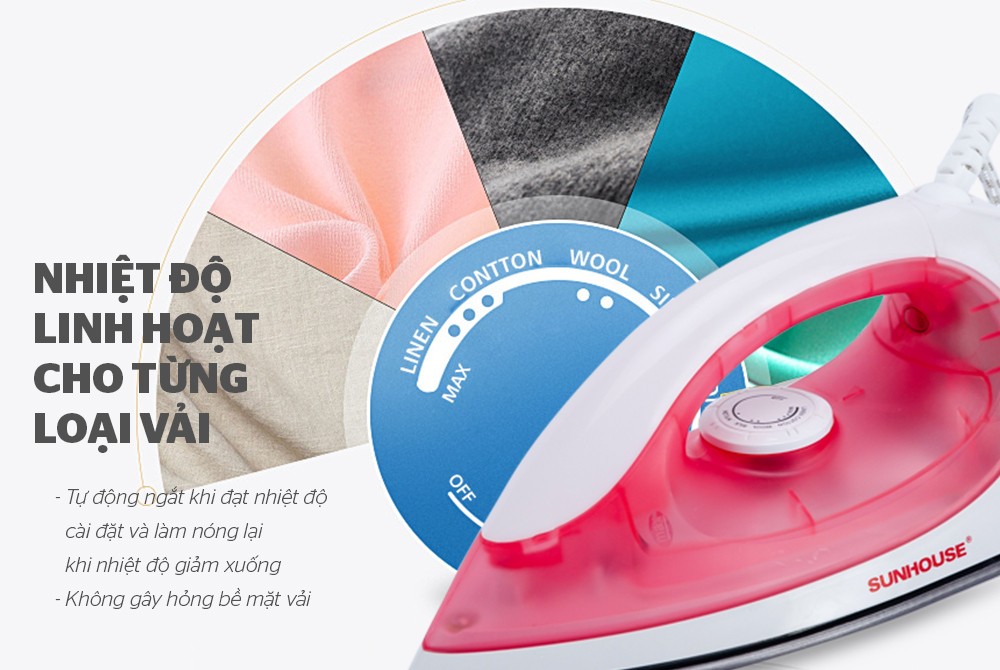 Bàn là khô Sunhouse SHD1072 hồng - Hàng chính hãng, Bàn Ủi Khô Công Suất 1100W ĐẶC ĐIỂM NỔI BẬT Chế độ điều chỉnh nhiệt độ linh hoạt và tiện dụng Bề mặt bàn là