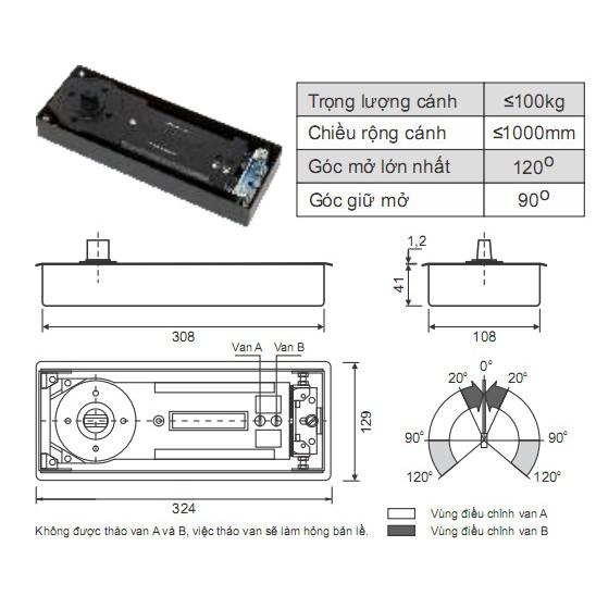 - Kiểu bản lề: Âm sàn, tự đóng 2 chiều.