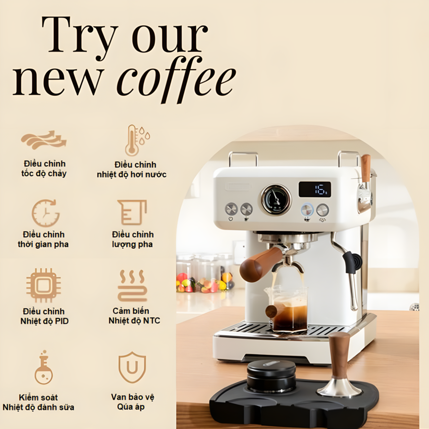 Bơm Italy áp suất 20 bar tạo ra tách cà phê đậm đà Công suất 1400W, điện áp 220-240V/50Hz-60Hz Gia nhiệt nhanh chóng, đảm bảo cà phê chiết xuất với nhiệt độ lý tưởng nhất