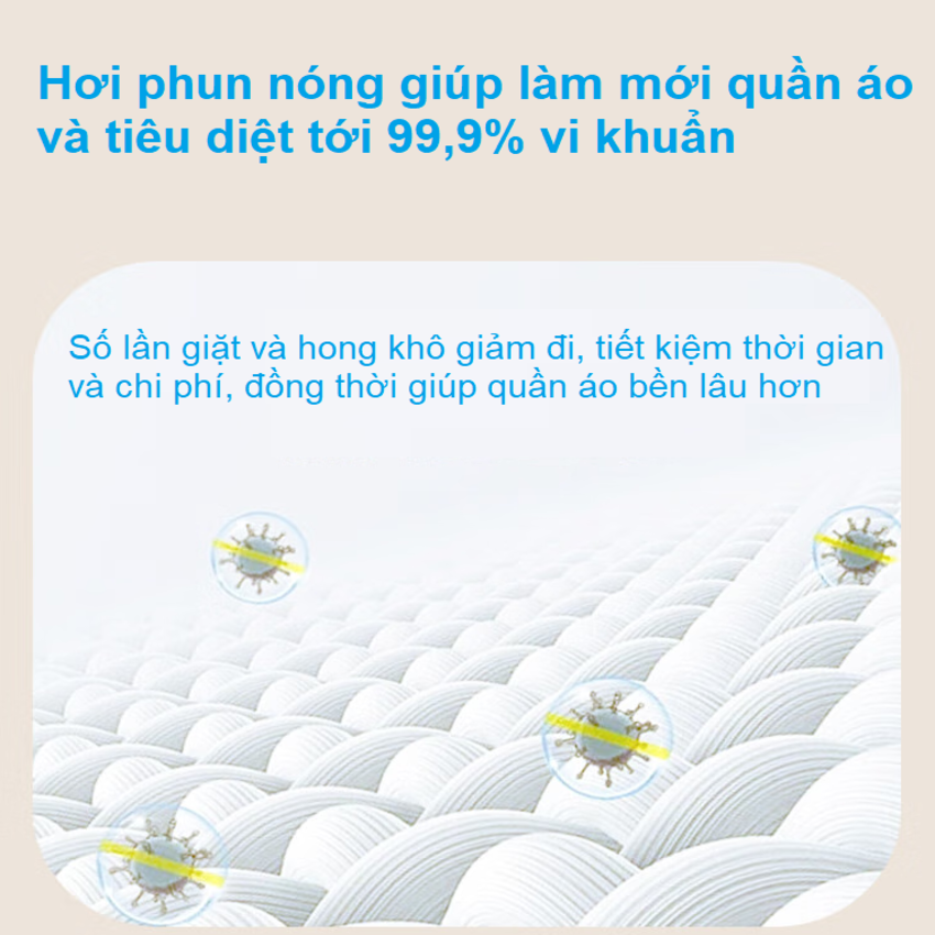 - Hơi phun nóng giúp làm mới quần áo và tiêu diệt tới 99,9% vi khuẩn. Số lần giặt và hong khô giảm đi, tiết kiệm thời gian và chi phí, đồng thời giúp quần áo bền lâu hơn. Tự động chuyển về chế độ chờ để đảm bảo an toàn