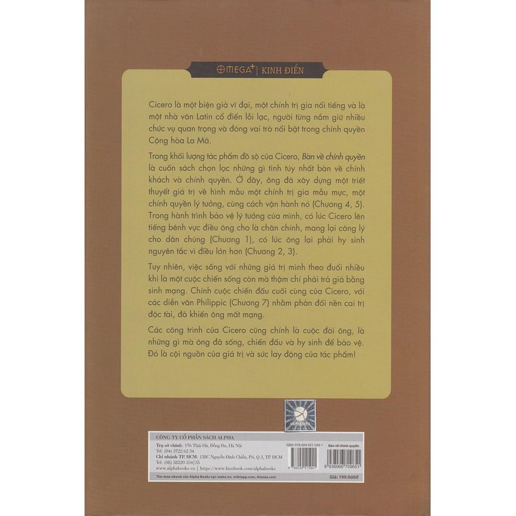 Mua tại TiktokLần đầu tiên một cuốn sách của triết gia vĩ đại Cicero được phát hành chính thức tại Việt Nam. Bàn về chính quyền là một trong những nền tảng tư tưởng của Phương Tây, cuốn sách nằm trong tủ sách kinh điển của Omega. Thuật cầm quyền có vai trò thiết yếu đối với cuộc sống của chúng ta, và là thứ nghệ thuật cực kỳ phức tạp. Chúng ta sẽ nhận ra độ phức tạp của nó khi xem xét những sai lầm kinh hoàng của những nhà cai trị xuyên suốt các thời đại, và vẫn còn tiếp diễn đến ngày nay. Vì vậy họ cần phải biết rõ hơn về công việc mà họ đang nỗ lực thực hiện, cũng như về thành tựu và sai sót nổi bật trong sự nghiệp của những chính quyền khác trong quá khứ. Về mặt này, chính quyền La Mã cổ đại hết sức phù hợp và không ai ngoài Cicero có thể bàn về nó. Cicero sinh ra tại Arpinium trong một gia đình bản xứ sung túc. Ông được đưa đến Rome để học tập theo định hướng sự nghiệp công, và vào năm 70 TCN ông đã vươn đến địa vị trạng sư hàng đầu ở Rome, nắm giữ nhiều chức vụ quan trọng và đóng vai trò nổi bật trong chính quyền Cộng hòa La Mã. Trong khối lượng tác phẩm đồ sộ của ông, Bàn về chính quyền là cuốn sách chọn lọc những gì tinh túy nhất bàn về chính khách và chính quyền. Bảy tác phẩm được tập hợp trong cuốn sách này diễn giải lòng tin đầy đam mê của ông trong việc hòa hợp quốc gia, chúng thể hiện trọn vẹn quyền lực vững mạnh của ông trong vai trò một biện giả và một tác giả. Các tác phẩm được trình bày dưới hình thức diễn văn và những cuộc thảo luận giả định. Với những hình thức này Cicero có thể thể hiện trọn vẹn trí tuệ, kiến thức và kỹ năng lập luận sắc sảo của mình. Những cuộc thảo luận giả định đầy thú vị xen những câu chuyện có phần châm biếm, hài hước cũng rất cuốn hút và giúp độc giả dễ hình dung, theo dõi. Các công trình của Cicero cũng chính là cuộc đời ông, là những gì mà ông đã sống, chiến đấu và hy sinh để bảo vệ. Đó chính là cội nguồn của giá trị và sức lay động của tác phẩm này. Xin trân trọng gửi đến độc giả cuốn sách này! TÁC GIẢ : Marcus Tullius Cicero Marcus Tullius Cicero (106 – 43 TCN) là một triết gia, chính khách, biện giả La Mã. Cicero sở hữu nhiều kỹ xảo đa dạng và khả năng làm chủ ngôn ngữ Latin đến độ phi thường. Ông đã viết một lượng lớn tác phẩm về lí tưởng và thực hành thuật hùng biện, về tôn giáo, cũng như về triết học đạo đức và chính trị. Tác giả: Marcus Tullius Cicero NXB: NXB Hồng Đức Năm XB: 05-2017 Trọng lượng (gr): 560 Kích thước: 16 x 24 Số trang: 544 Hình thức: Bìa Cứng Ngôn ngữ: Sách tiếng Việt