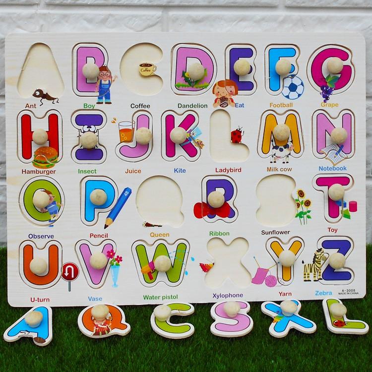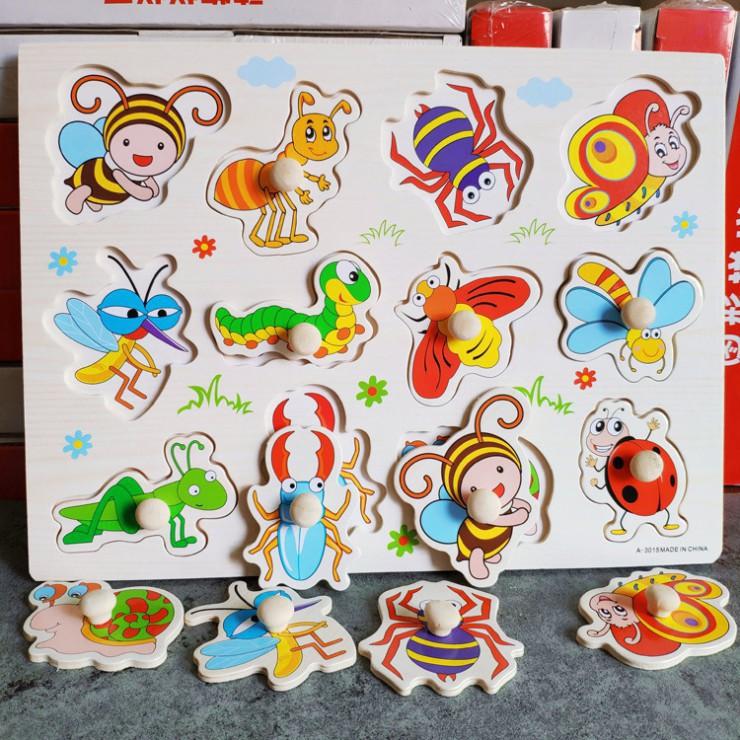 BẢNG GHÉP HÌNH NÚM GỖ là một tấm bảng gỗ với những hình ghép vào các vị trí nhất định. Những hình ghép này được cắt bằng máy theo khuôn hình nên khi lắp vào sẽ khớp với các ô trống trên bảng. Những hình ghép được gắn núm cầm bằng gỗ để trẻ cầm dễ dàng và thuận tiện hơn. Có rất nhiều loại Bảng ghép hình núm gỗ với các hình ảnh ngộ nghĩnh và đa dạng. Bạn có thể chọn mua bảng ghép hình chữ số, hình côn trùng, hình trái cây hay hình động vật tùy theo ý thích. Trên tấm bảng gỗ có tên của hình ghép bằng tiếng Anh nên trẻ còn có thể vừa học vừa chơi và nhớ kỹ cách đọc của chúng. Trẻ sẽ học được vô vàn kiến thức bổ ích khi chơi trò chơi này.