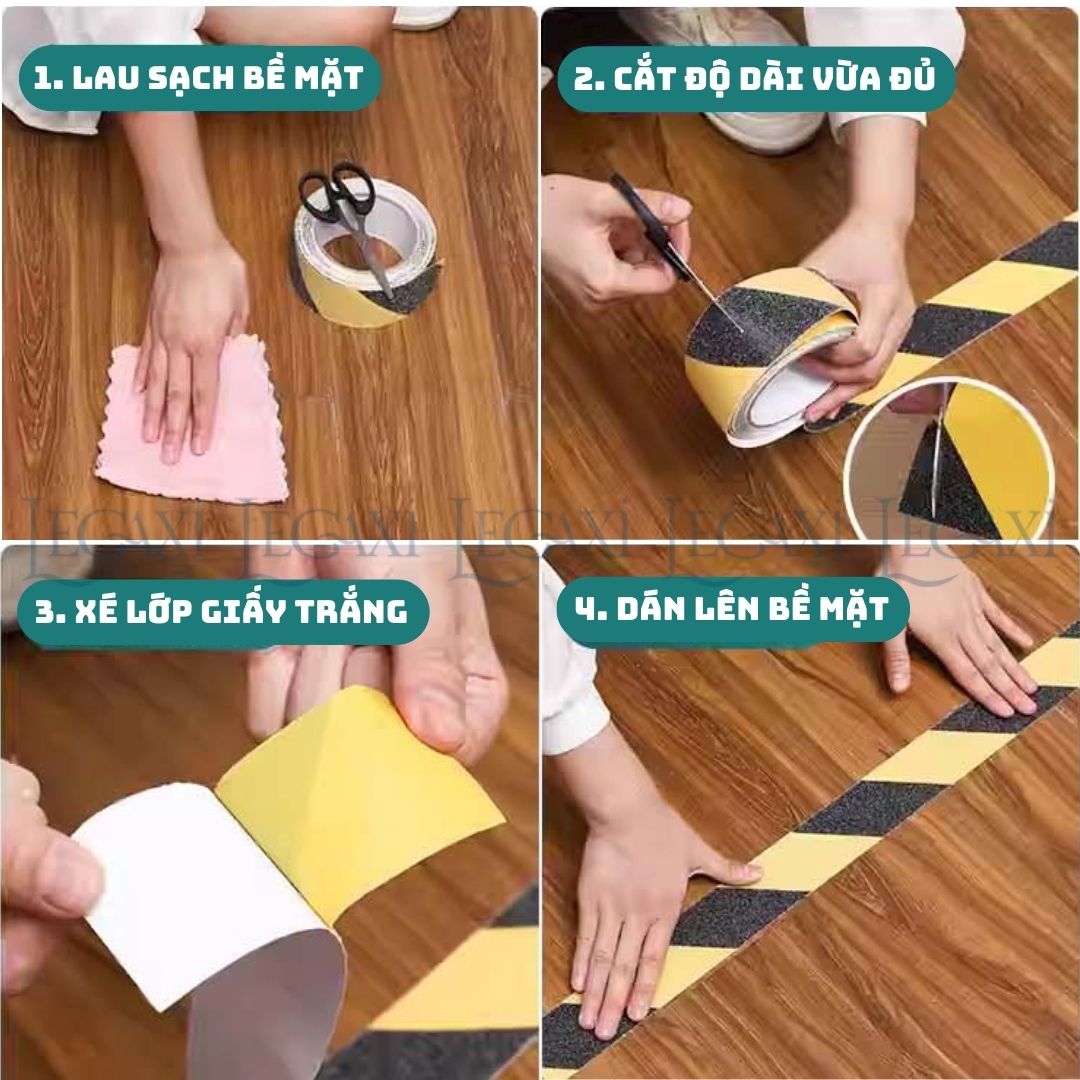 THÔNG TIN SẢN PHẨM Kích thước sản phẩm: Chiều rộng 5cm, Dày 0.75mm. 2 độ dài để lựa chọn: Cuộn 5 mét và cuộn 10 mét. Màu sắc: Đen vàng nổi bật. Cấu tạo: Lớp keo siêu dính + lớp PVC + Bề mặt Carbon tạo độ nhám. CÔNG DỤNG Chống trượt cầu thang, bậc thềm, sàn nhà, Chống trượt công trường chung cư, trường học, bệnh viện, xe bus, cơ sở công cộng, Giúp dễ dàng nhận biết mép các bậc thang, tăng thêm độ an toàn cho bước đi. Đặc biệt phù hợp cho nhà có người cao tuổi hoặc trẻ em hiếu động. Có thể sử dụng để đánh dấu các khu vực, phân cách cũng như là cảnh báo khu vực có máy móc đặc biệt cần chú ý. Có thể dùng làm đồ mài móng khi chán. HƯỚNG DẪN SỬ DỤNG Bước 1: Vệ sinh và làm khô bề mặt cần dán. Lưu ý: Phải để cho bề mặt khô hoàn toàn trước khi dán. Bước 2: Đo và cắt độ dài băng dính cần dùng. Bước 3 (Không bắt buộc): Cắt 2 đầu đoạn băng dính cần dùng thành hình vòng cung (Bo tròn) để không bị nhấc mép. Bước 4: Bóc lớp giấy dán phía sau và dán lên bề mặt. Tips: Không bóc toàn bộ lớp giấy dán ngay mà vừa dán vừa bóc để nếp dán trông thẩm mỹ hơn. Bước 5: Sử dụng búa cao su, hoặc con lăn để ép băng keo tiếp xúc và dính hoàn toàn vào bề mặt (từ giữa ra mép băng keo). Có thể dùng máy sấy tóc làm nóng keo để kết dính tốt nhất.