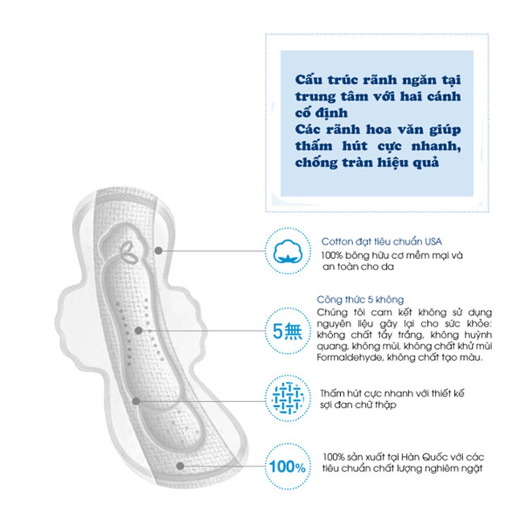 Băng vệ sinh với hai cánh trải rộng ra sau, chống lệch, co rúm, cùng hệ thống chống tràn, chống thấm ngược trở lại tối đa khi nằm và thay đổi tư thế, giúp bạn có ngủ sâu êm ái