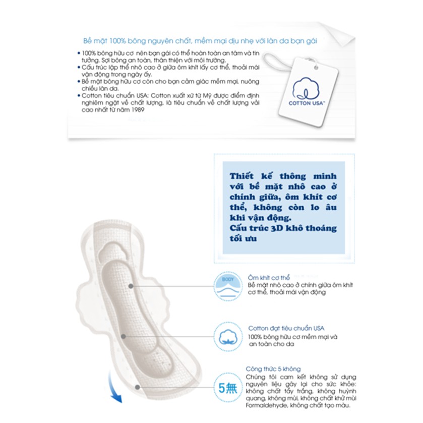 Sản phẩm với bề mặt được làm từ thành phần vải sợi không dệt thuần bông, mềm mại như bông cùng hệ thống thoát khi thông thoáng hạn chế tối đa việc tiếp xúc với da, loại bỏ mùi hôi và giúp phòng tránh tối đa nguy cơ bị hăm da do sử dụng băng vệ sinh quá lâu vào ban đêm.